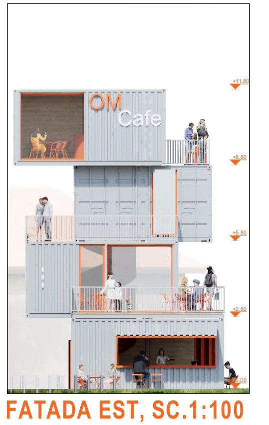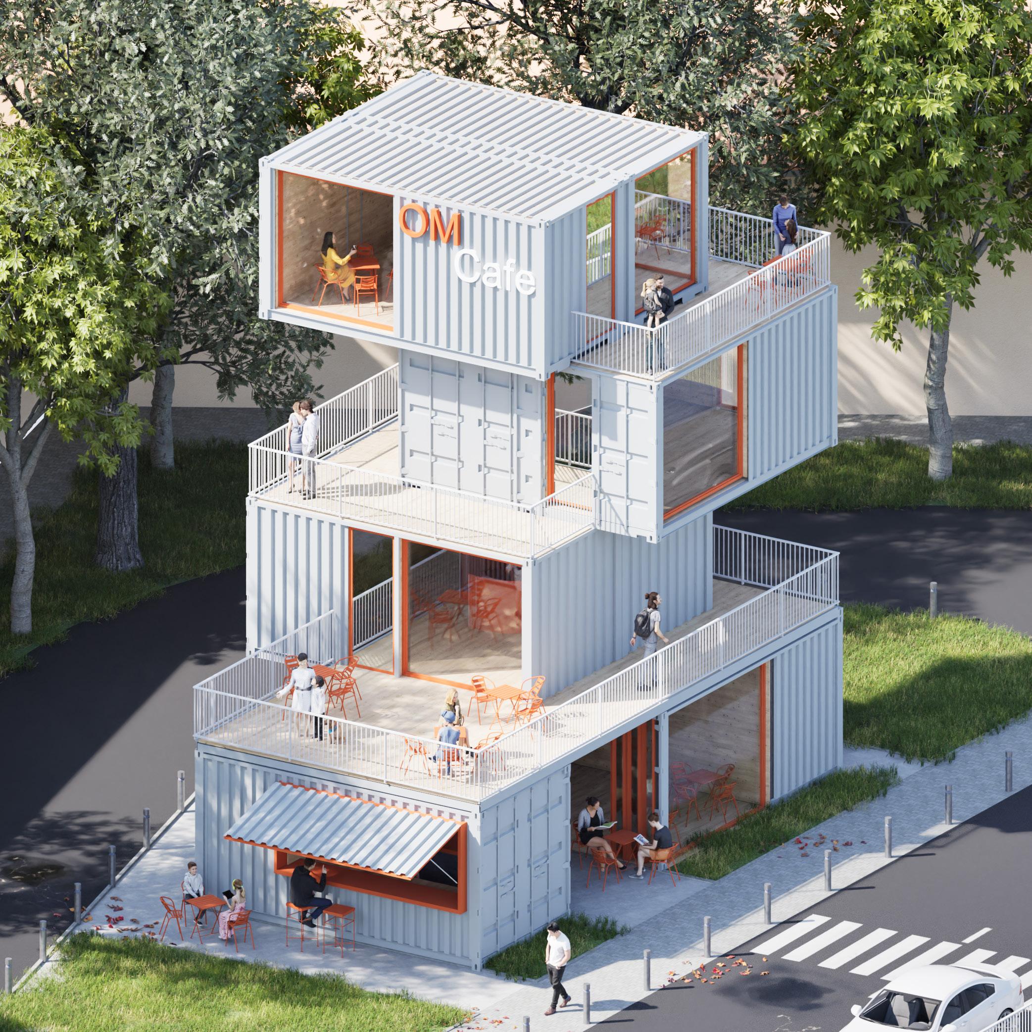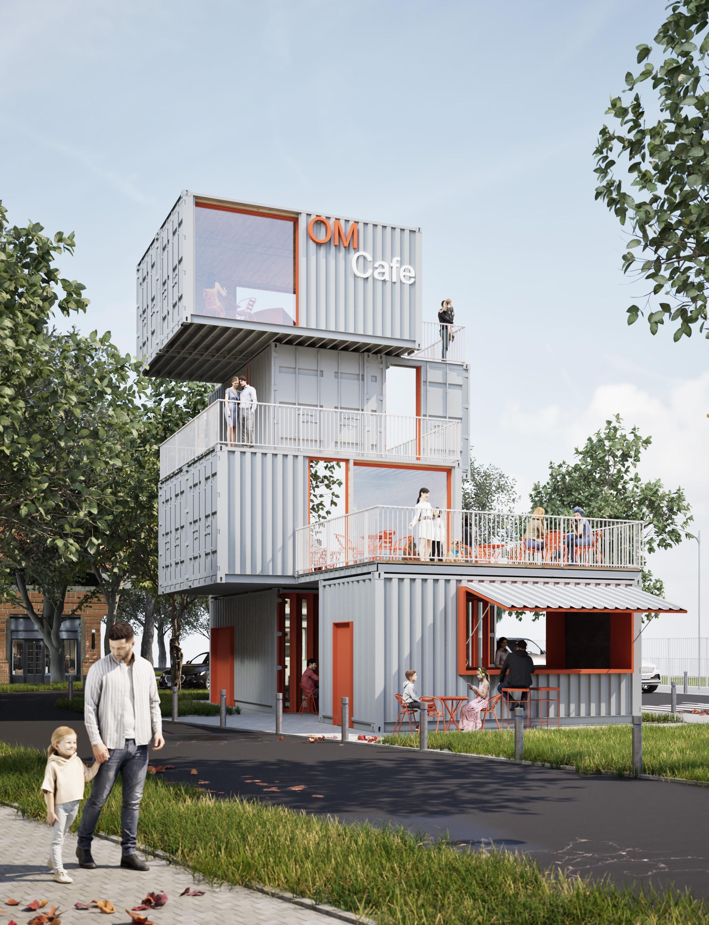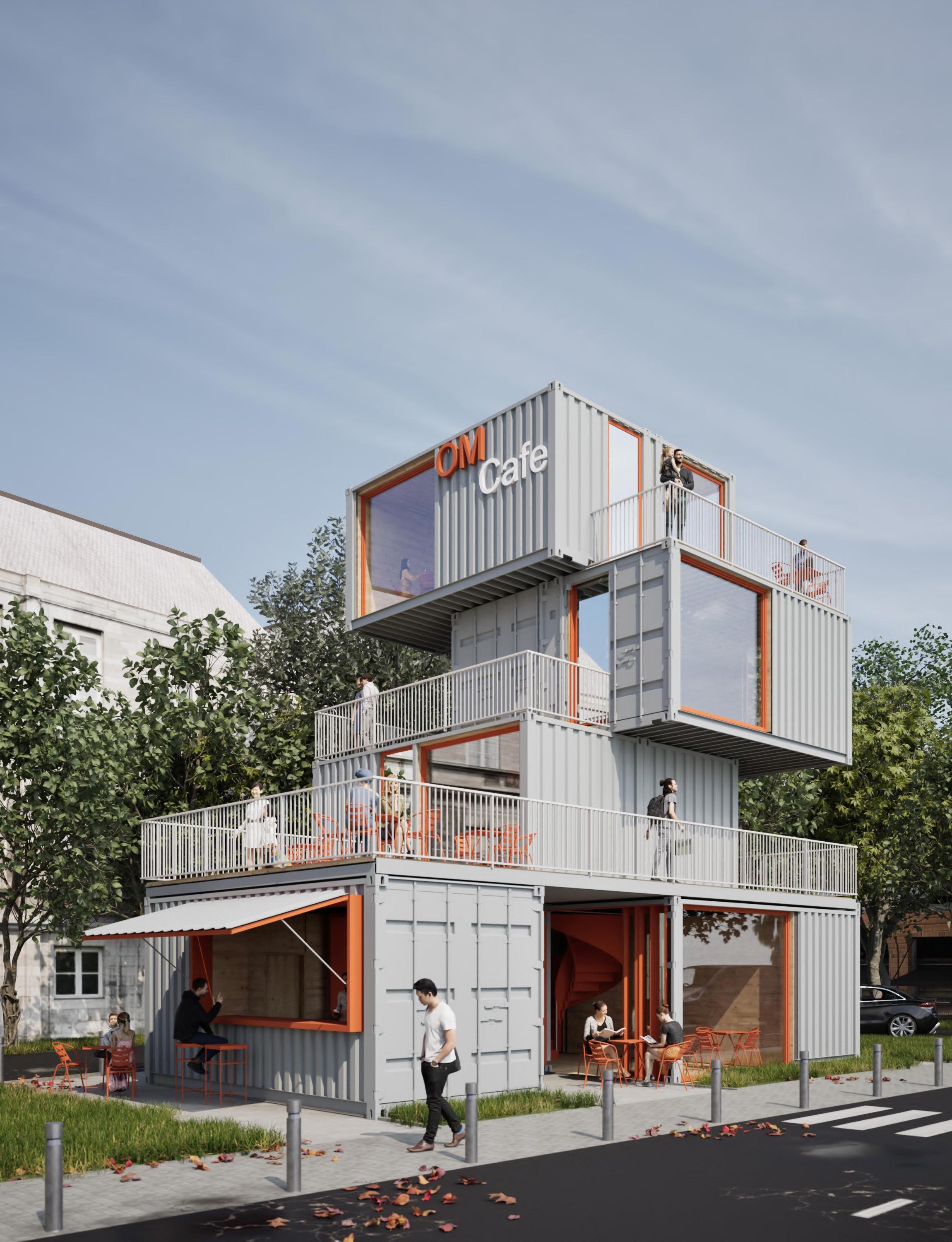 One of the distinctive features of this structure is the vibrant orange metal spiral staircase that runs vertically through the modules, adding a modern and dynamic accent to the entire building. The choice of orange was made not only to provide a pleasant visual contrast, but also to catch the attention of visitors, turning OM Café into a focal point.