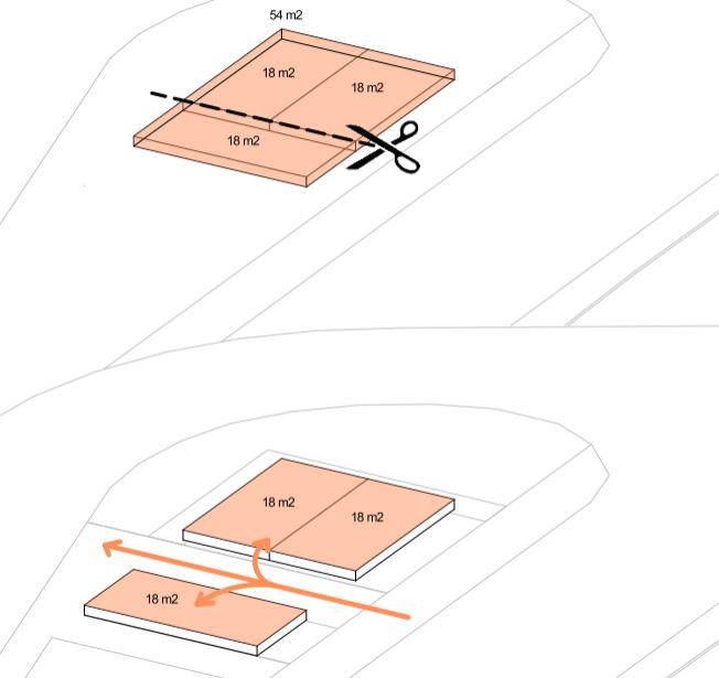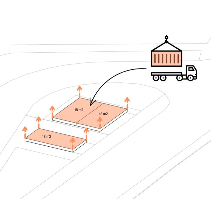 The concept starts from a 54 m² volume, divided into three equal 18 m² modules. These units are then shifted and rearranged to create a dynamic modular composition, allowing the café to adapt to the site while generating terraces and outdoor lookout areas.