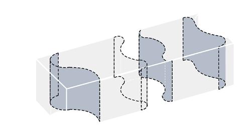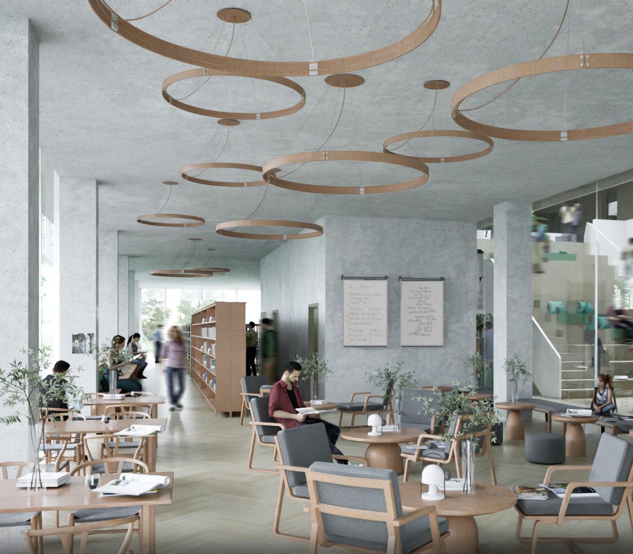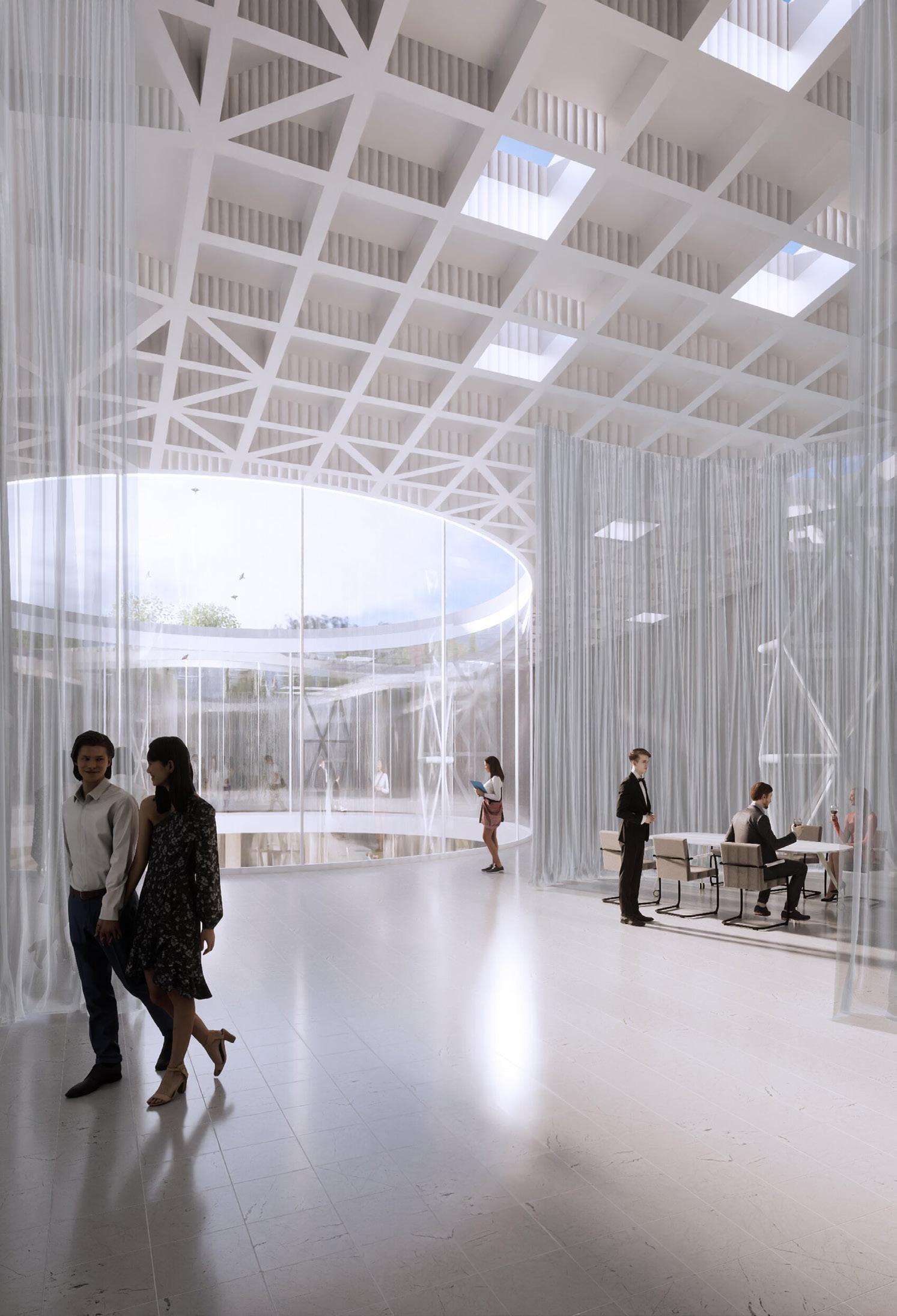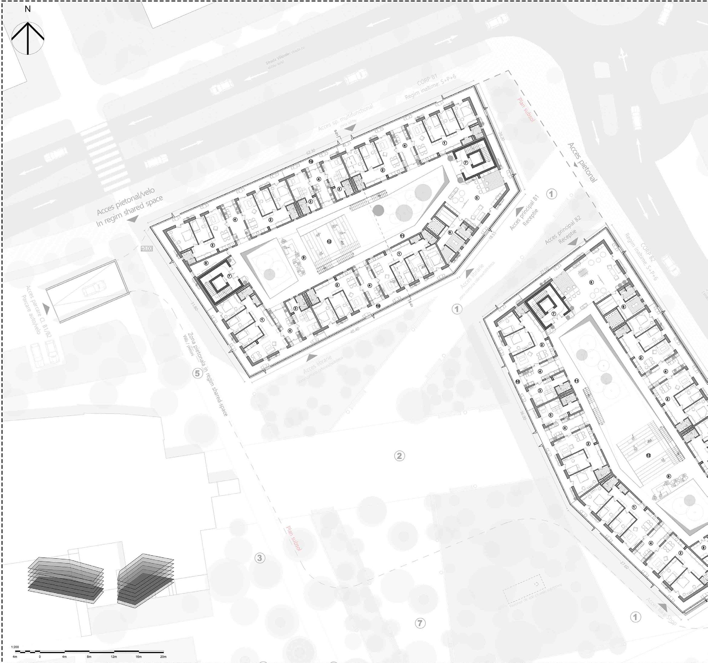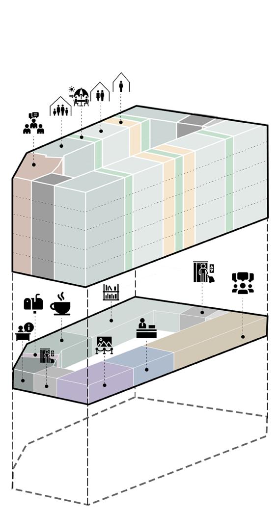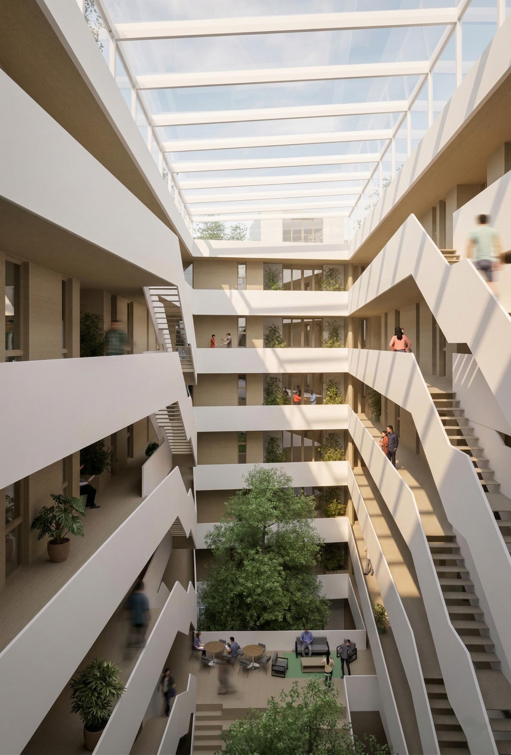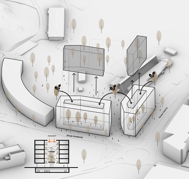 Interior courtyards and atriums are introduced into the buildings, bringing natural light inside and organizing the main internal circulation.
