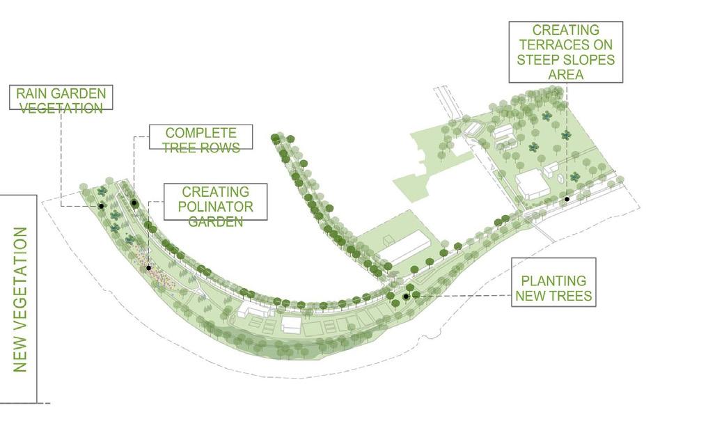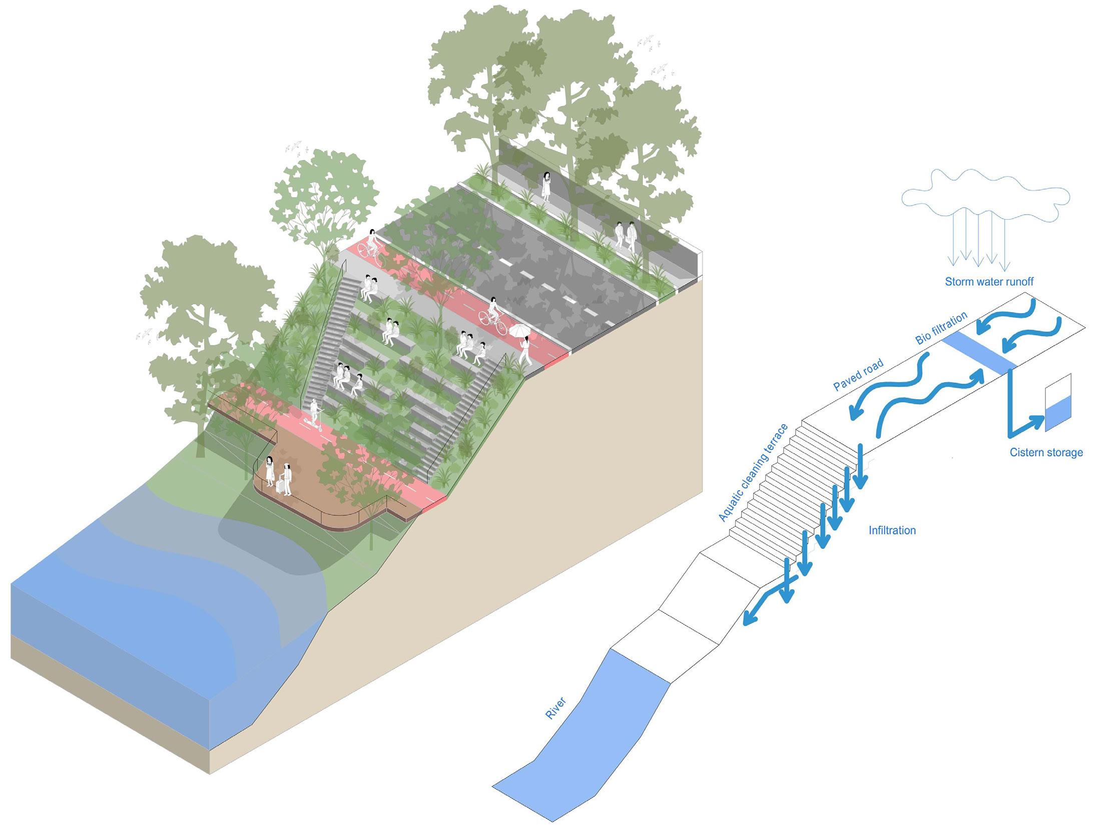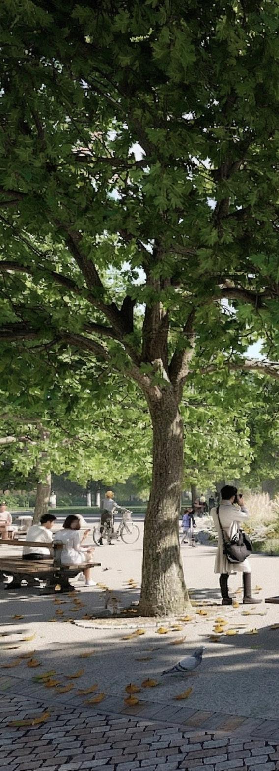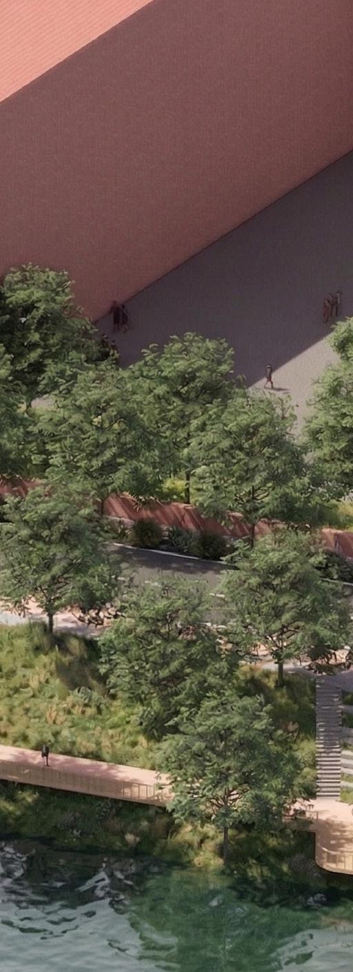 The project proposes the landscape and functional regeneration of the Tiber riverfront in Rome’s Marconi district, transforming a fragmented urban edge into a continuous linear park. The intervention aims to reconnect the neighborhood with the river, increase vegetation and tree canopy, and introduce a network of pedestrian and cycling paths. The masterplan integrates a variety of public spaces, including belvedere points, decks, relaxation areas, playgrounds, sports facilities, an outdoor market, and cultural spaces, creating a more accessible, active, and resilient urban landscape. The project focuses on climate adaptation, biodiversity, urban wellness, and on redefining the relationship between the city and the river.
