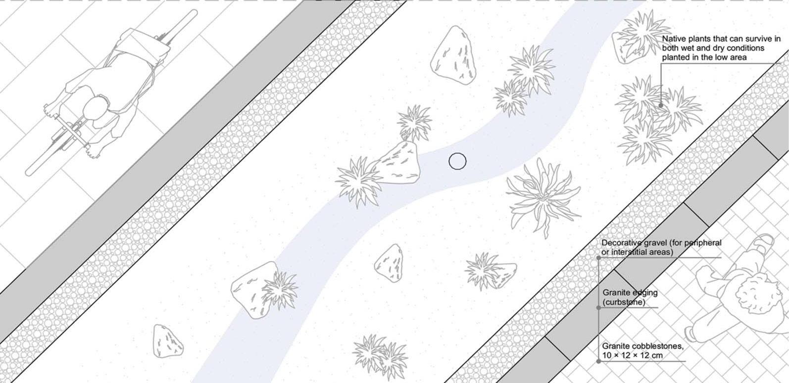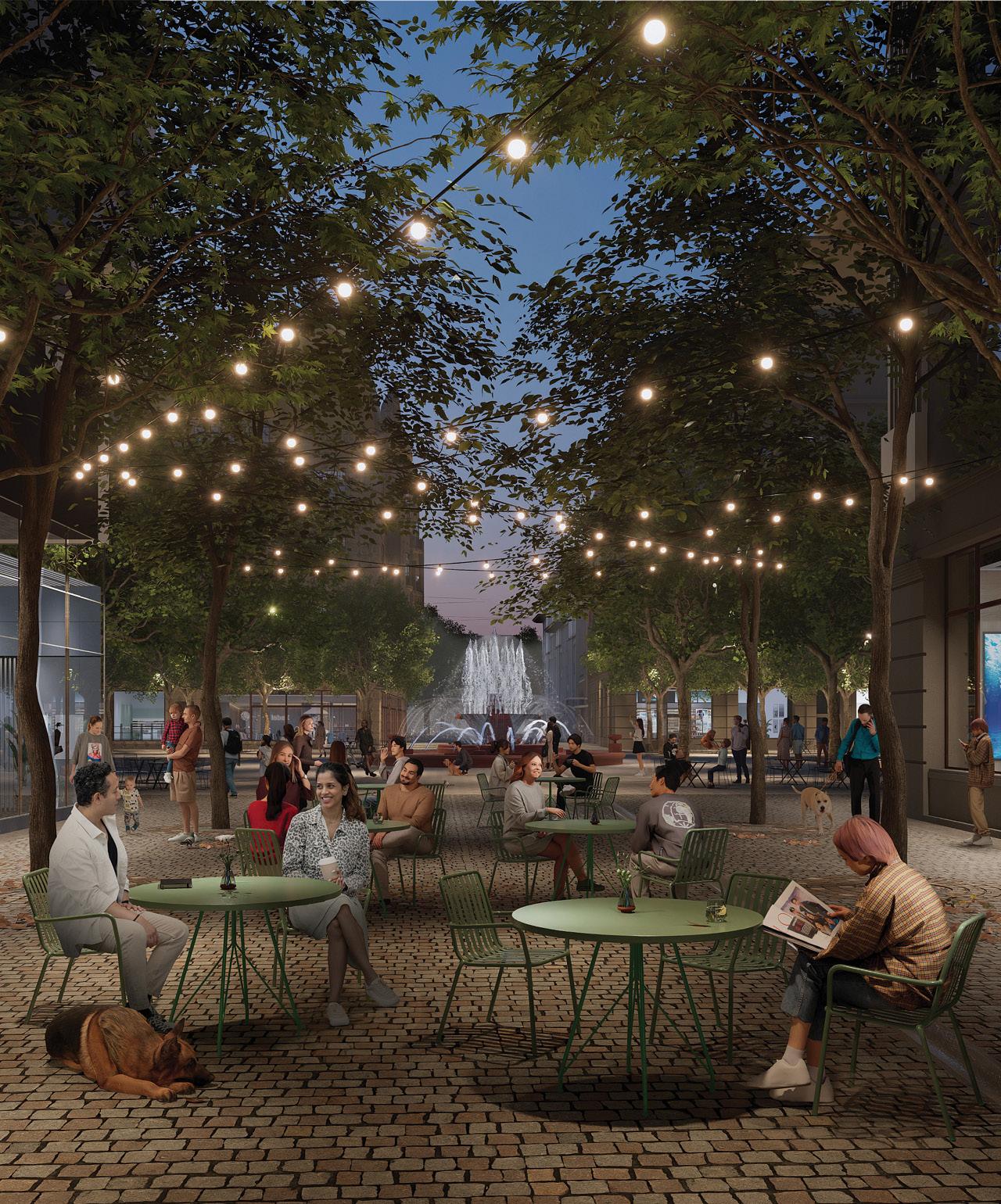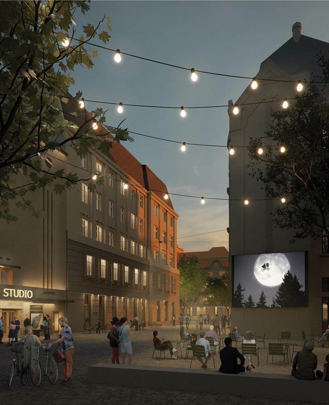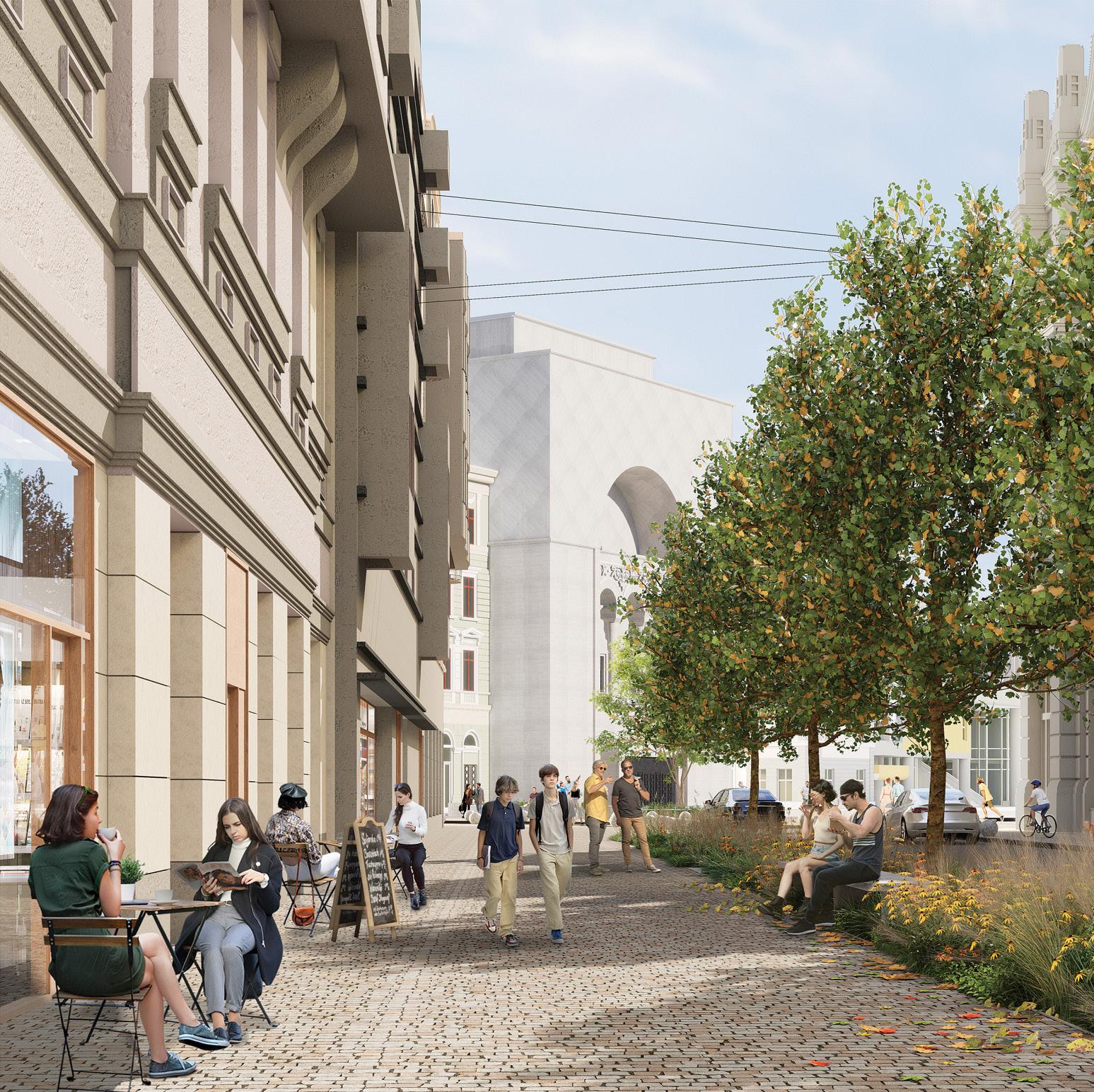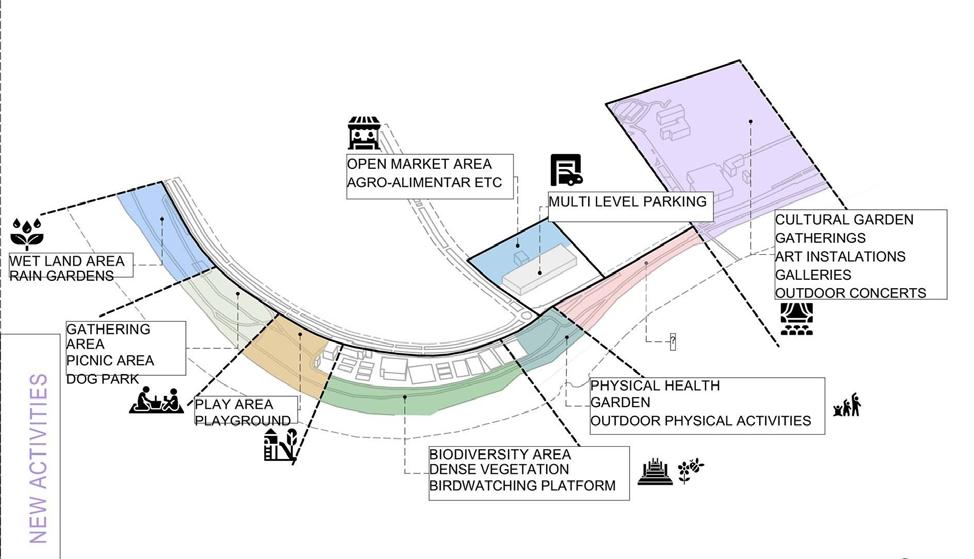 The central area is envisioned as a people-friendly space, with imited car a cess, encouraging community life, relaxation and social interaction.
