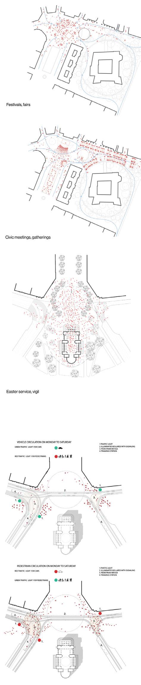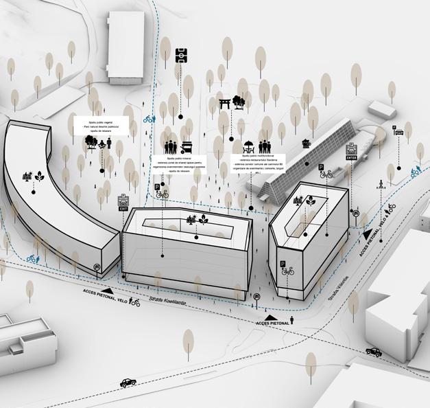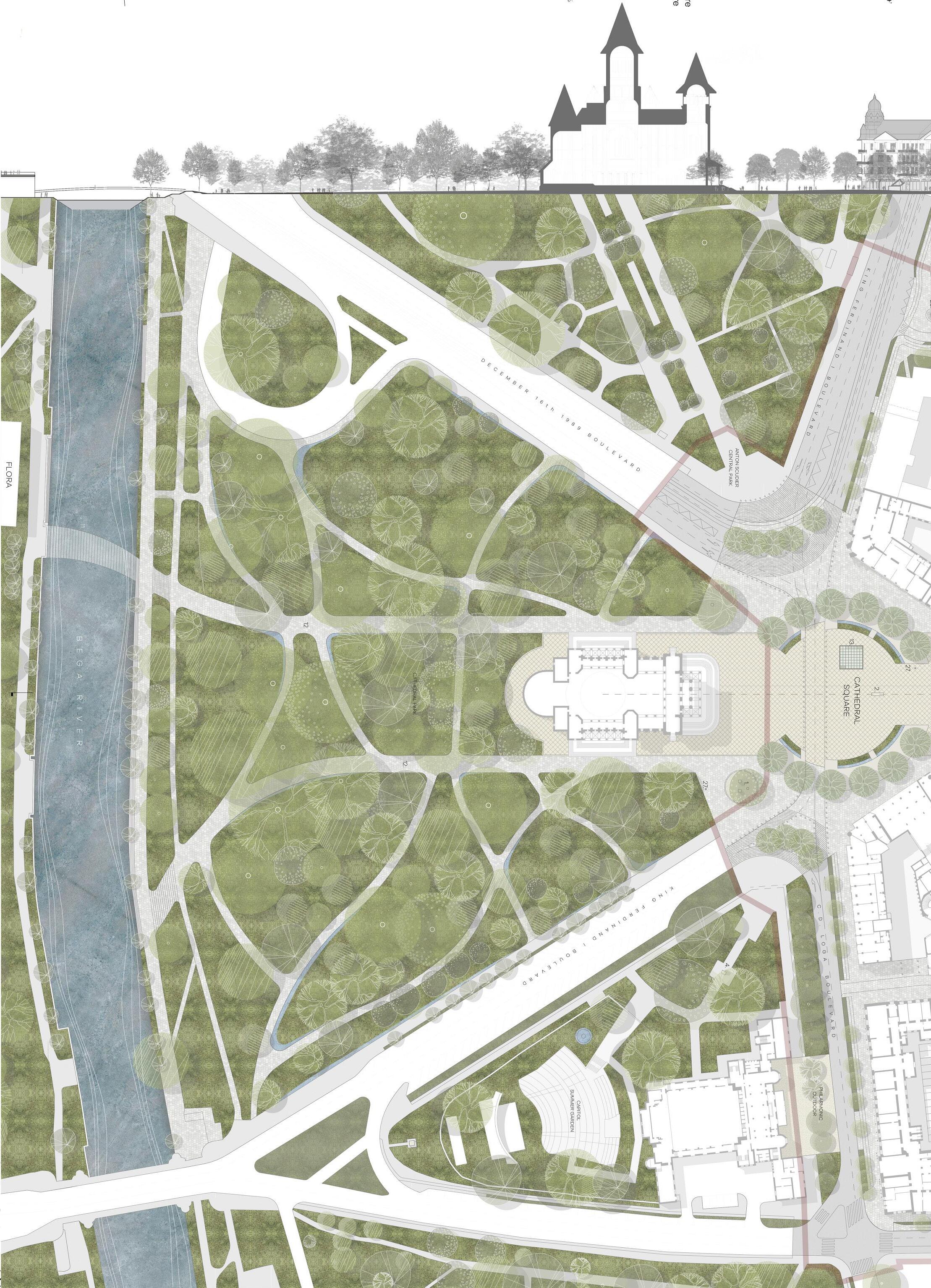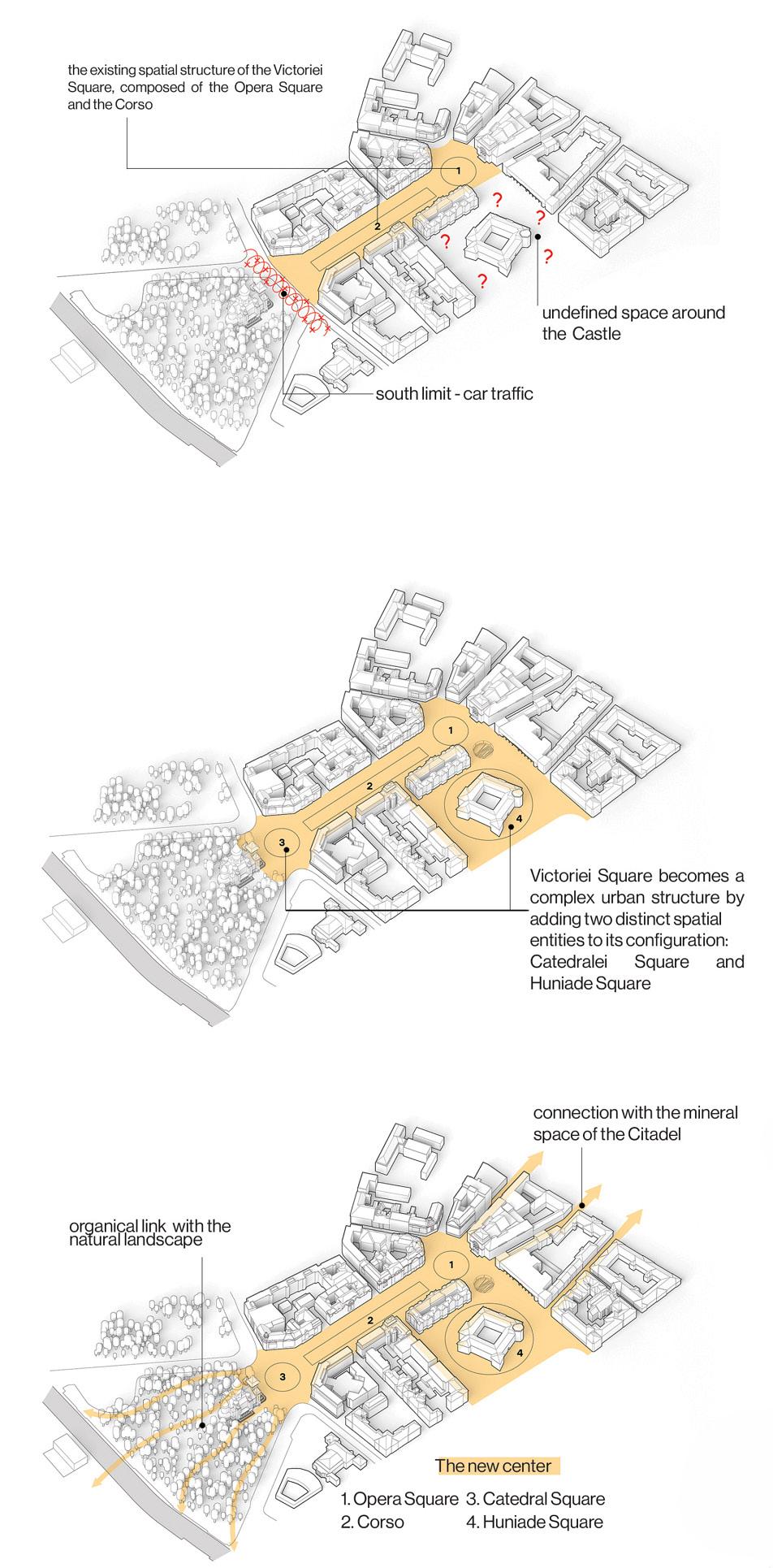 The approach involves three intervention pillars: strengthening the character of the two existing spaces, Opera Square and Corso; connecting the ensemble to the green-blue corridor and thereby bringing its elements into the interior of the square; recovering and integrating the space of the Castle into the Victoriei Square spatial system. Connecting to the green-blue corridor and recovering the Castle space lead to an ensemble of Victoriei Square structured into four distinct spatial entities: Opera Square, Corso, Cathedral Square, and Castle Square. They form a unified ensemble while ensuring connections, adjacency, and perspectives for the future evolution of the territory.