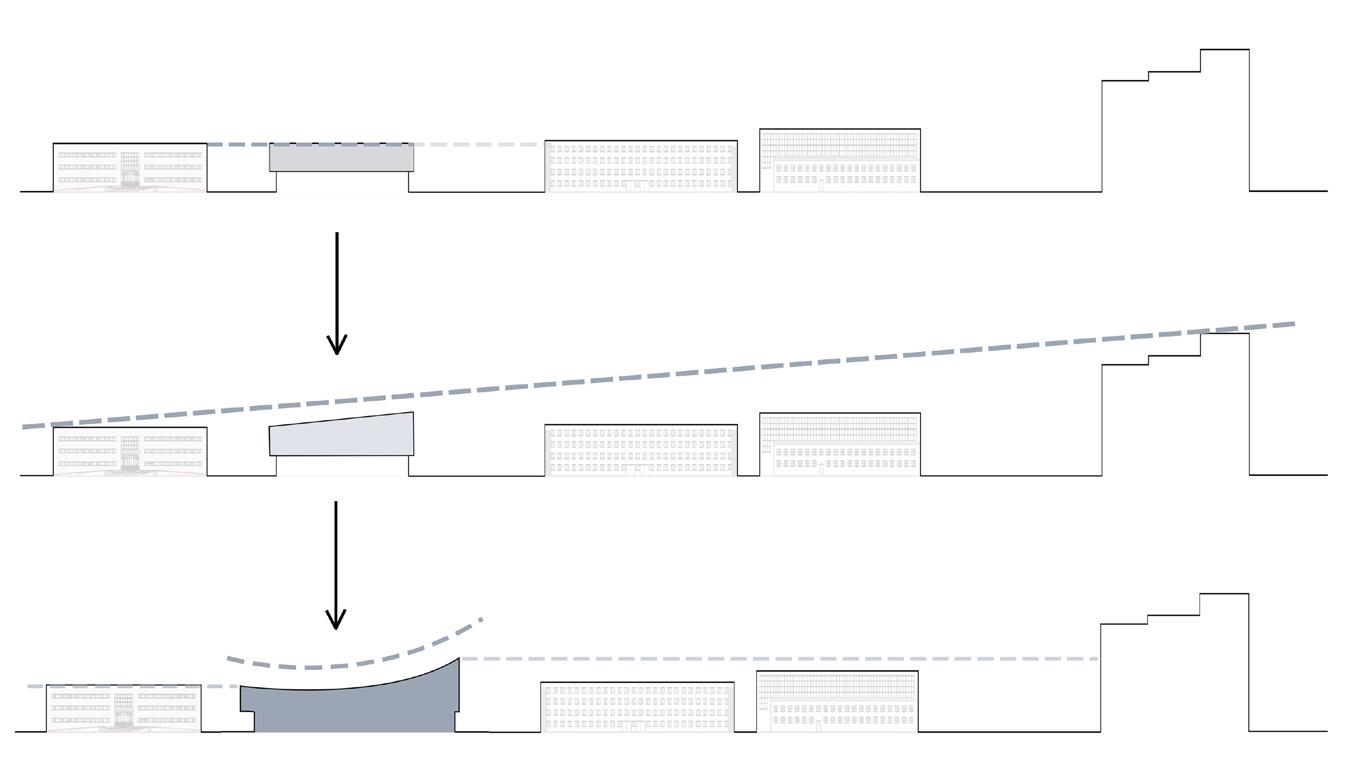 Cuts are introduced in the massing to improve the relationship with the existing buildings and to create key visual points.