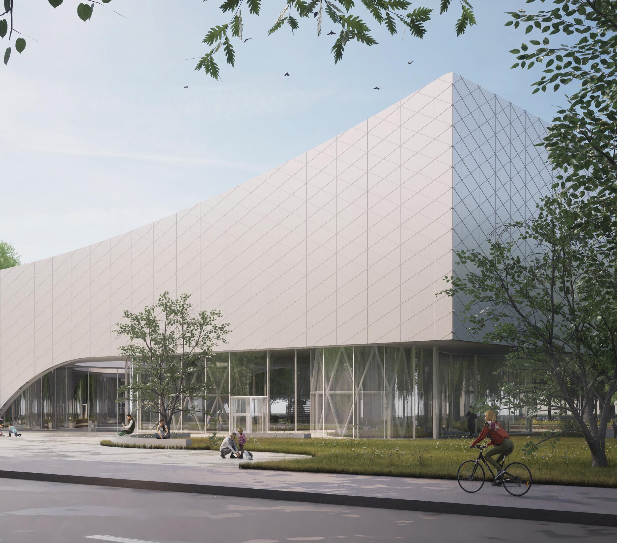 A continuous facade is applied to both the new volumes and existing building, creating a coherent architectural identity across the ensemble.