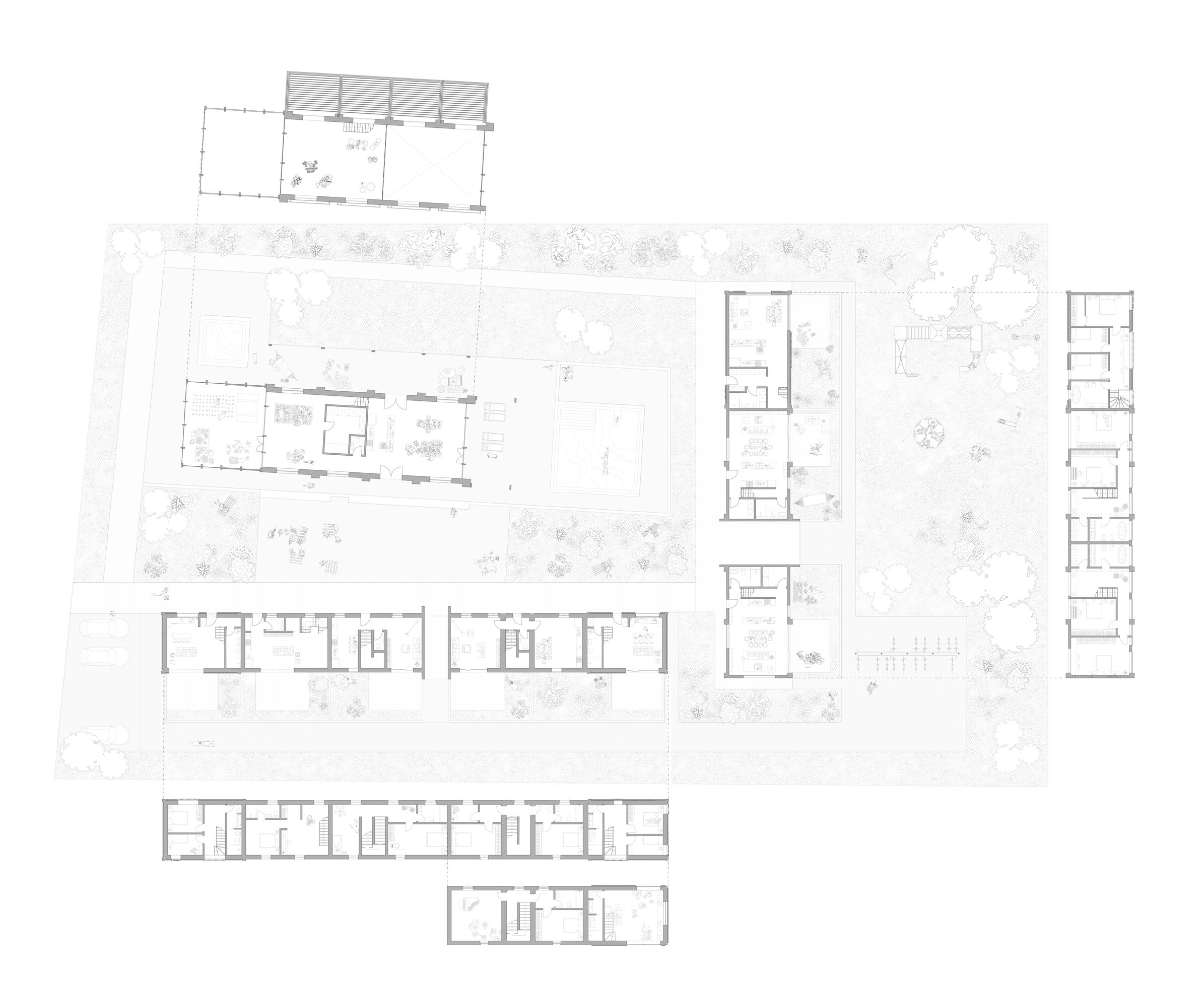 The site is fragmented into multiple volumes oriented toward a protected central core, separating the inner life from the city.