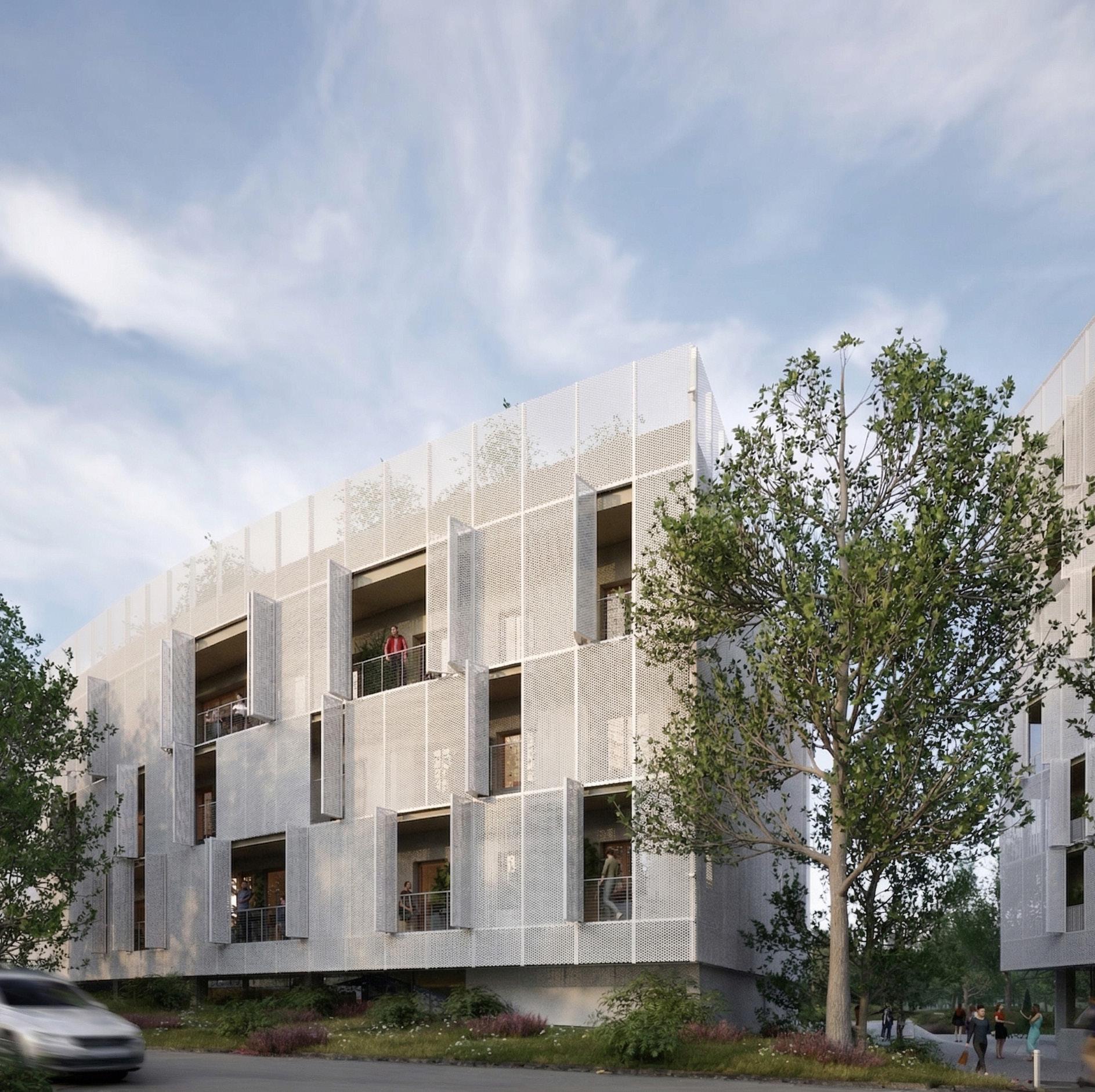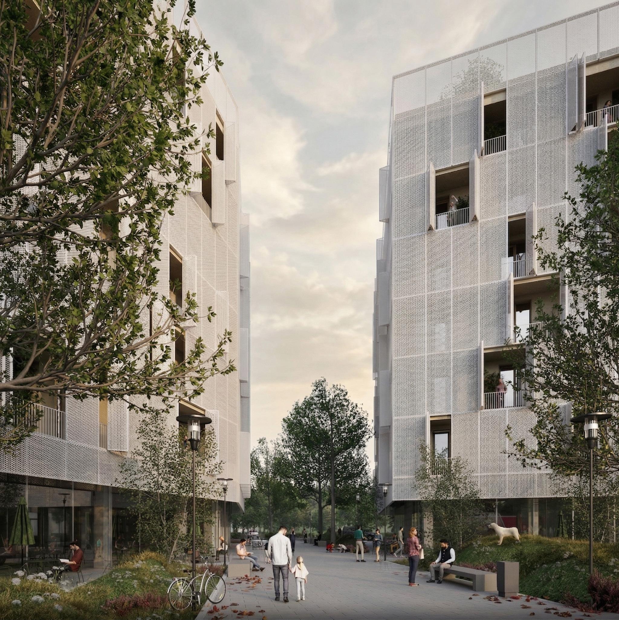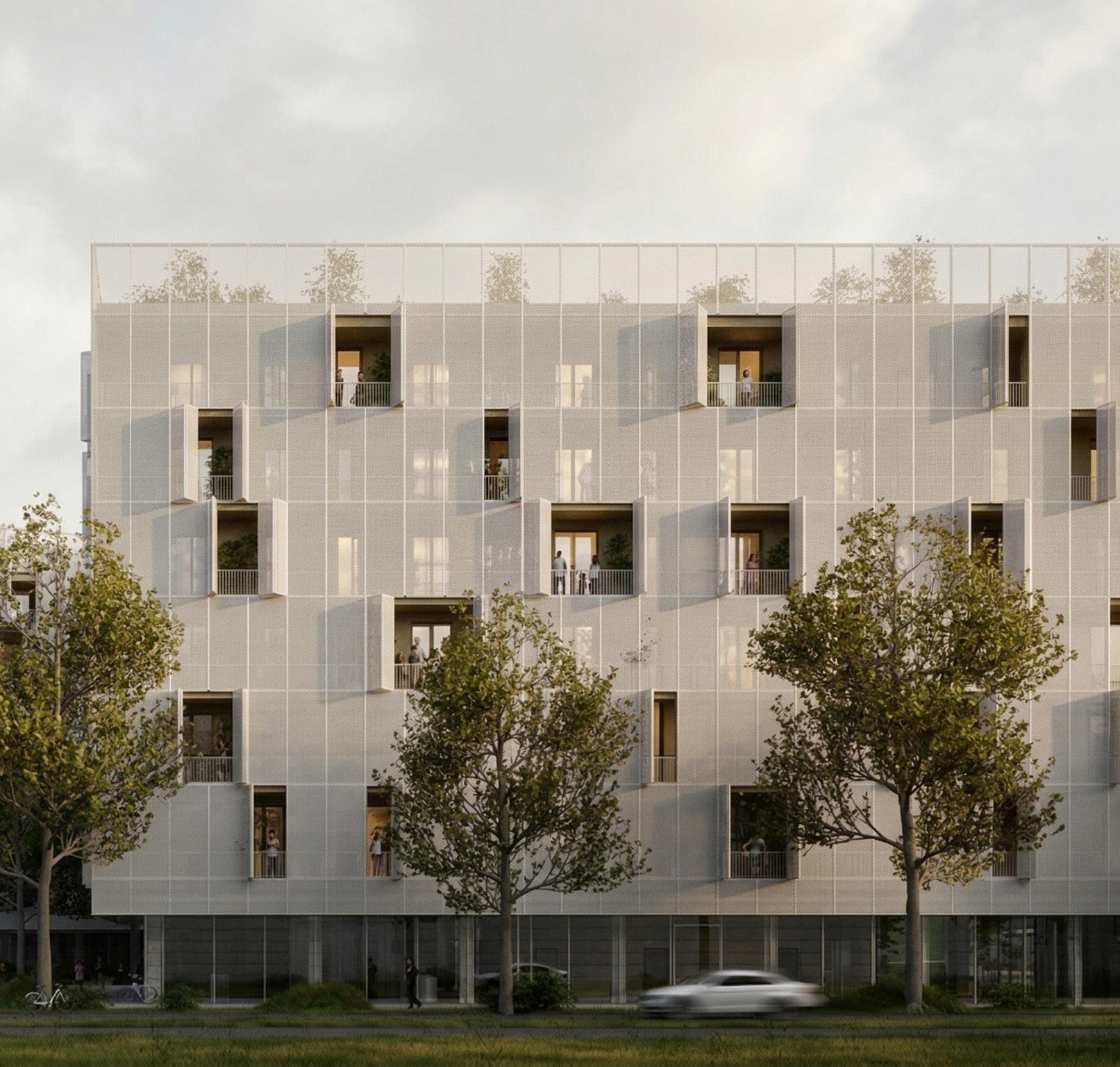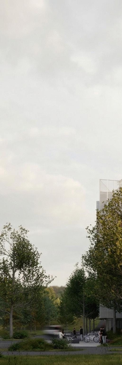 The buildings frame the site while opening toward the surrounding green areas, creating clear pedestrian routes and generous shared outdoor spaces. The proposal strengthens the connection to nature through planted terraces, open spaces, and an overall sustainable urban approach.