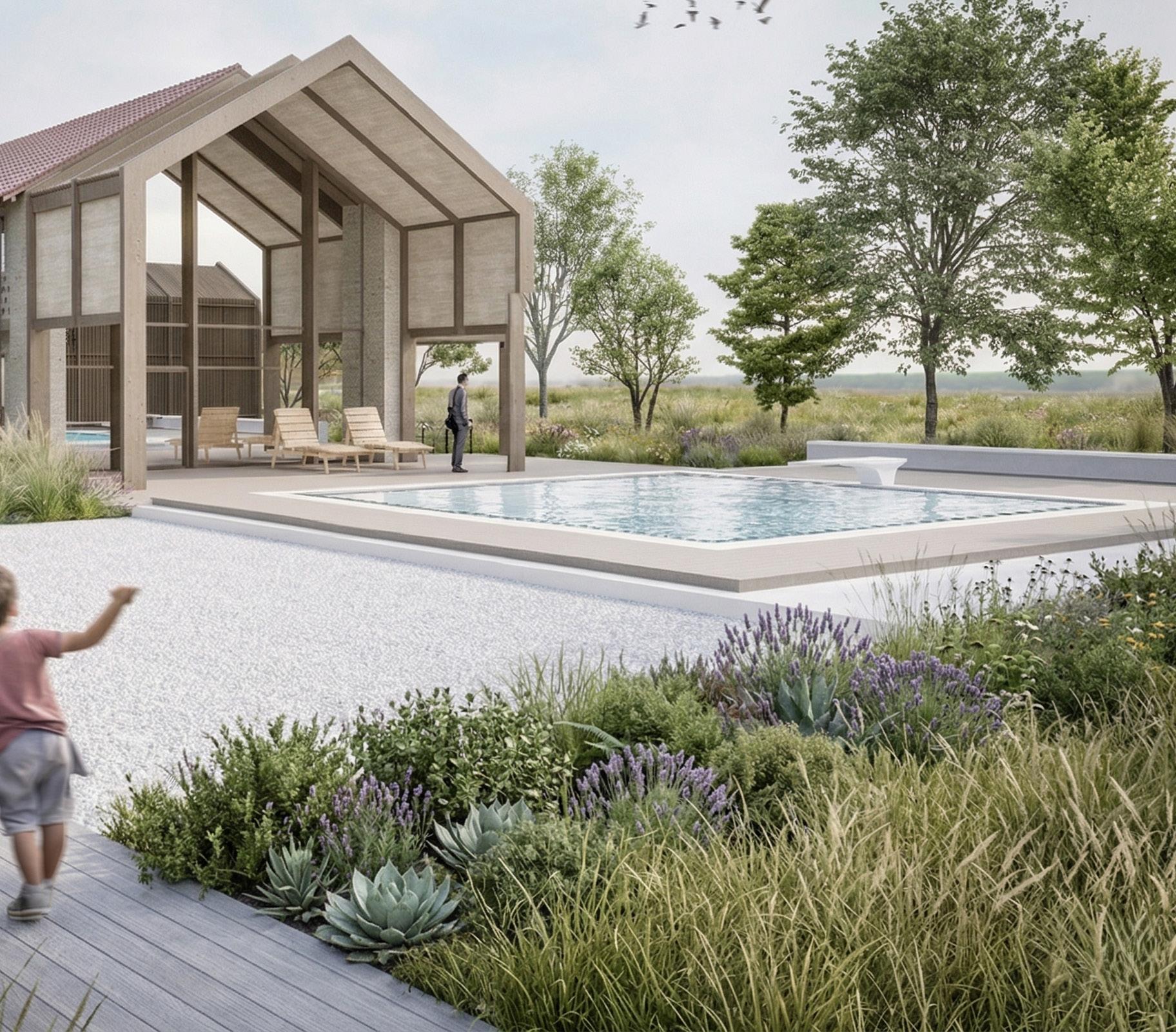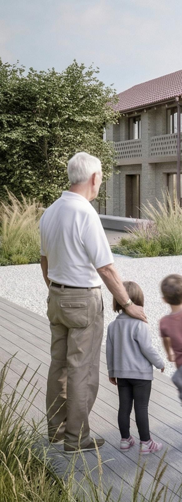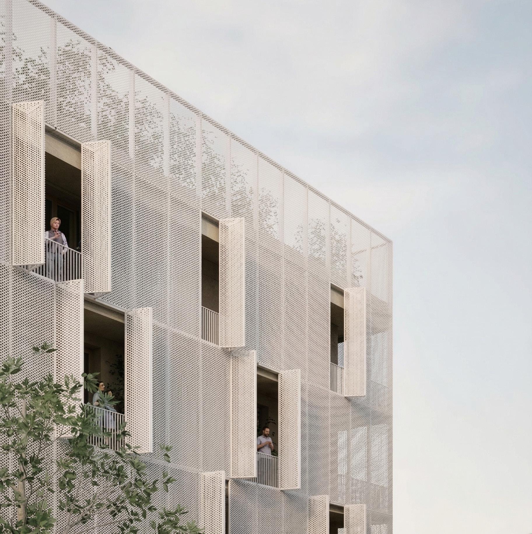 The buildings frame the site while opening toward the surrounding green areas, creating clear pedestrian routes and generous shared outdoor spaces. The proposal strengthens the connection to nature through planted terraces, open spaces, and an overall sustainable urban approach.