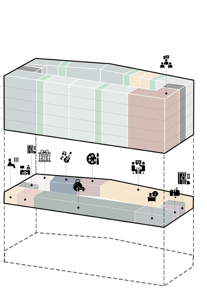 The diagram highlights the functional organization of the project, showing how the modular volumes accommodate indoor seating, service spaces, terraces, and lookout areas. The vertical layout creates a clear separation of functions while offering varied spatial experiences.