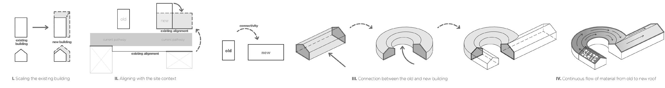 The existing building is extended vertically and horizontally to establish a similar scale with the new construction.