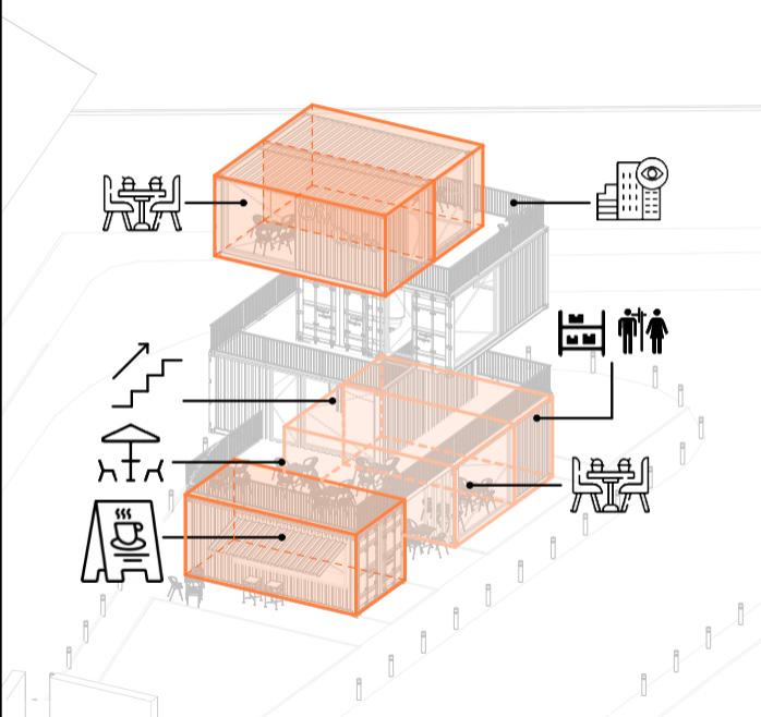The diagram illustrates the vertical composition of the café through the stacking and offsetting of modular container units. This arrangement creates a dynamic volumetric structure while maximizing space efficiency and generating terraces at different levels.