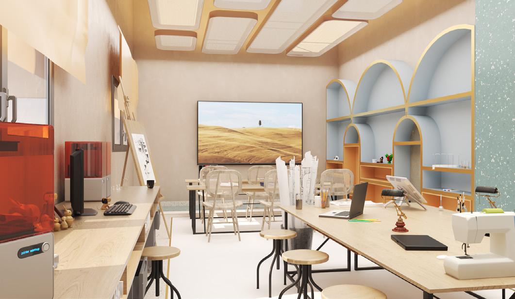 These elements are elegantly embodied in the interior space through the use of beige color to represent the outer shell of the human body, presented with luxurious stone veneer. The red color prominently appears in the interaction area inside the body, using rammed earth that reflects the region’s nature.