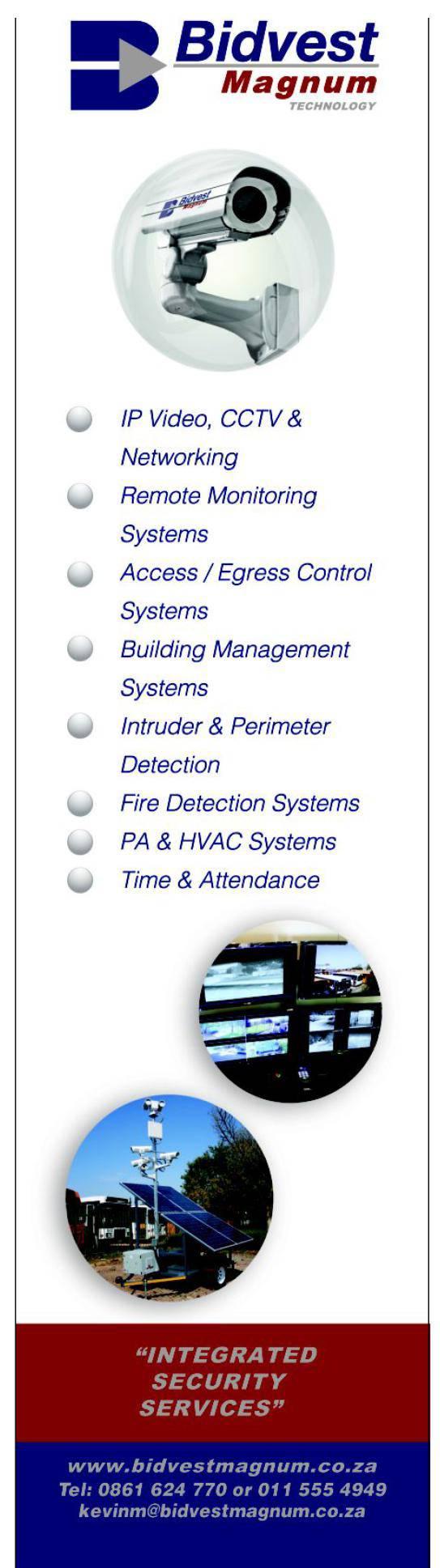 Perimeter control, video surveillance, communica on, Radio Frequency Iden fica on (RFID), access control and or intrusion detec on are some of the solu ons to the unique security issues at mines according to Mark Freer and David Hunter of Bytes Systems Integra on. The advent of the Ethernet has brought along integrated solu ons granted broadband and fibre cabling. Current systems house not only the requisite security component but in addi on offer management and surveillance tools that are vital to high produc on levels and quality The internet as a backbone of integrated solu ons con nues to allow for individual systems to be connected via fibre cables, microwaves, wireless links and ADSL.