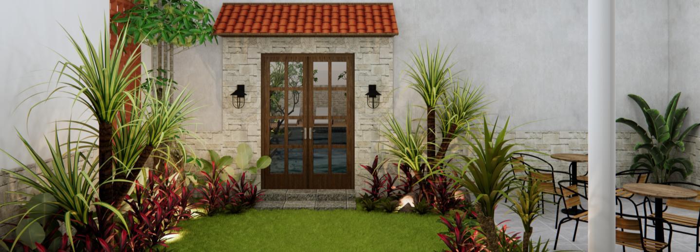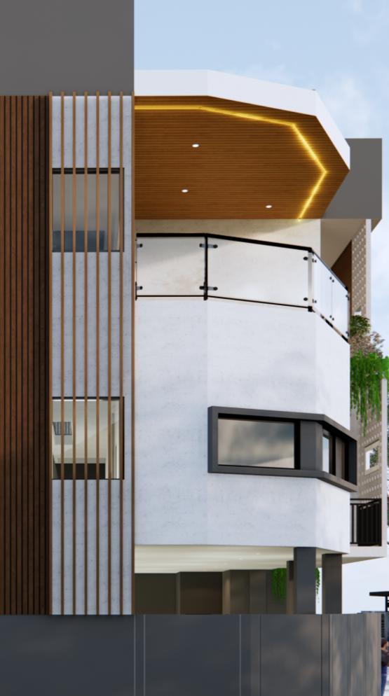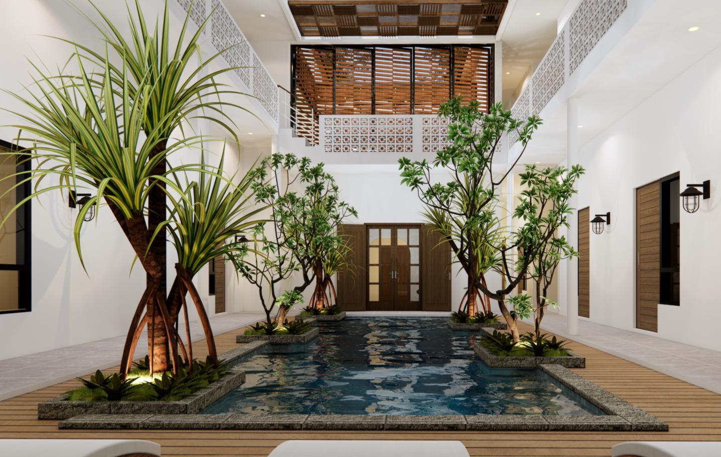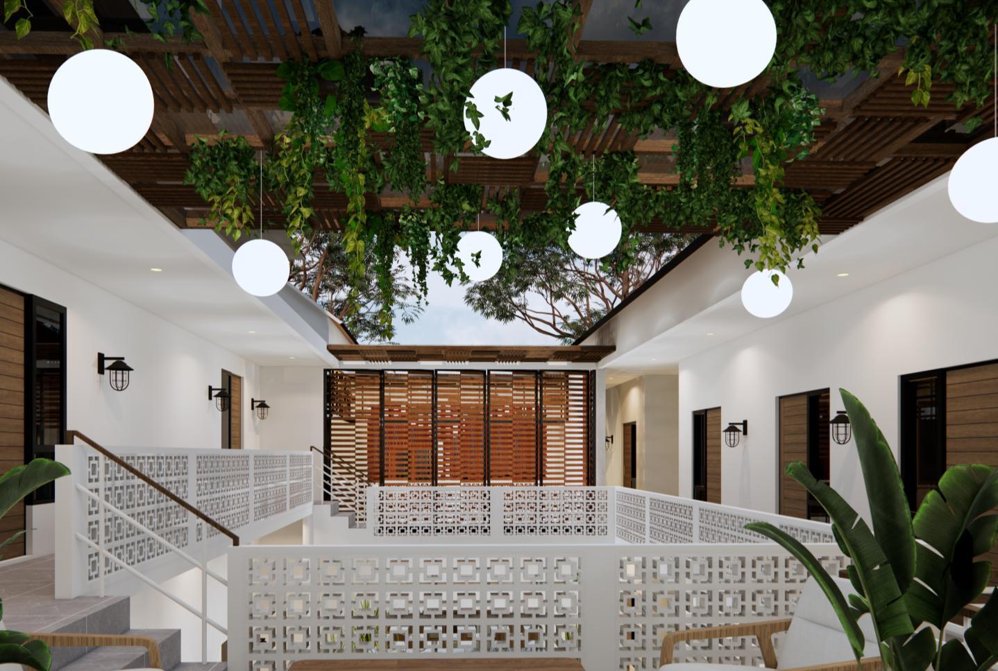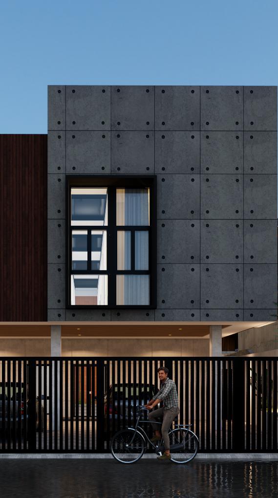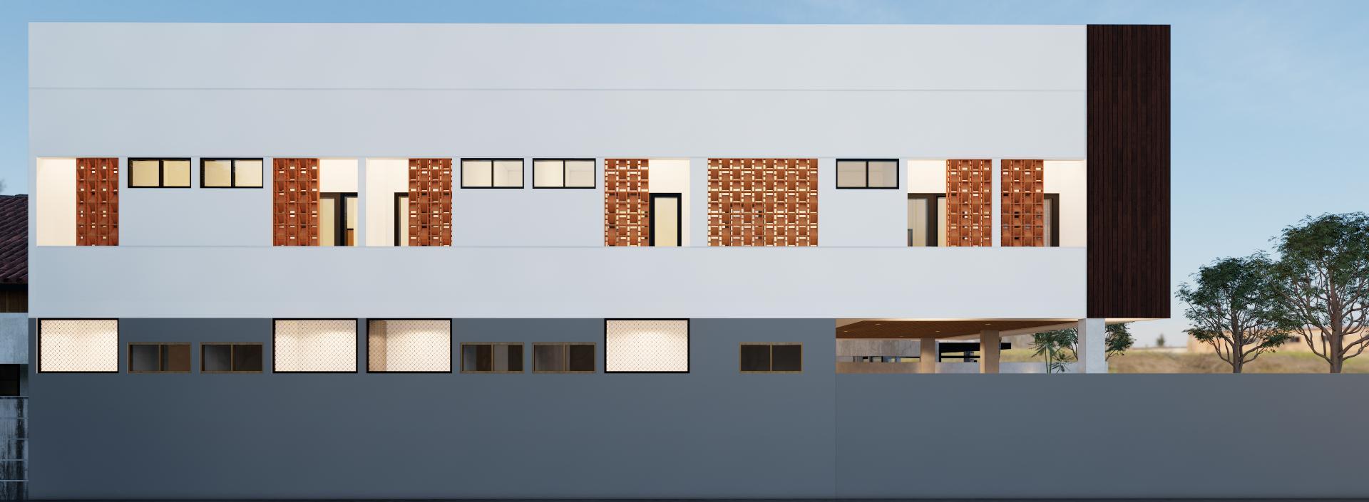Thefrontsidefacade,perforated concrete blocksroster and vertical wooden slats are used. These materials not only make the building visually appealing but also help reduce the heat from sunlight entering the interior.