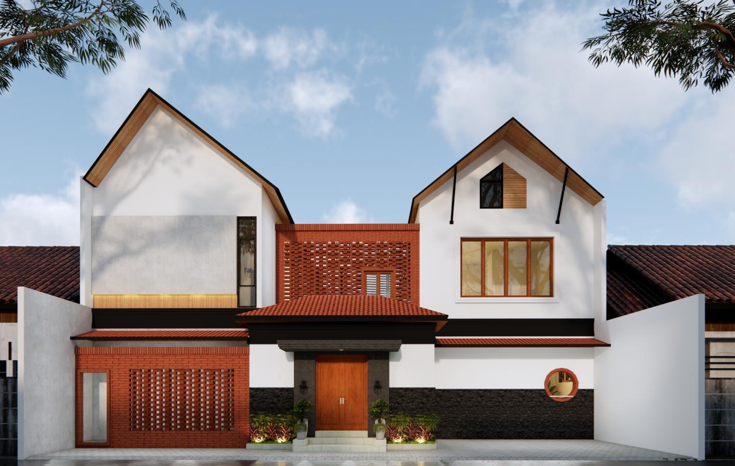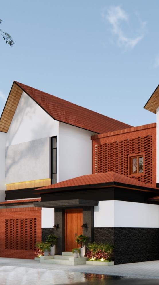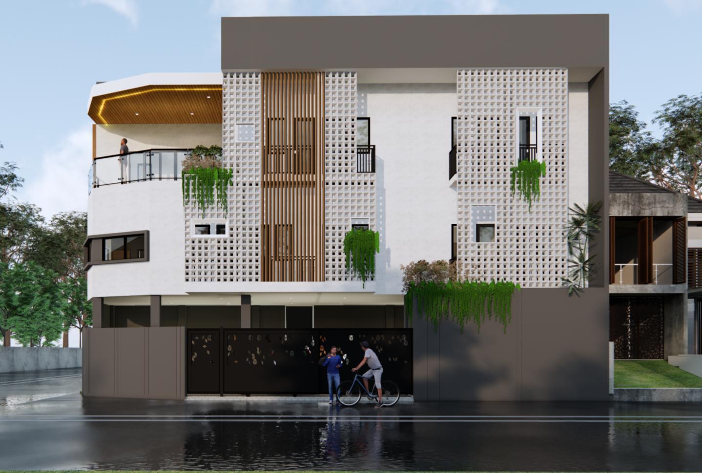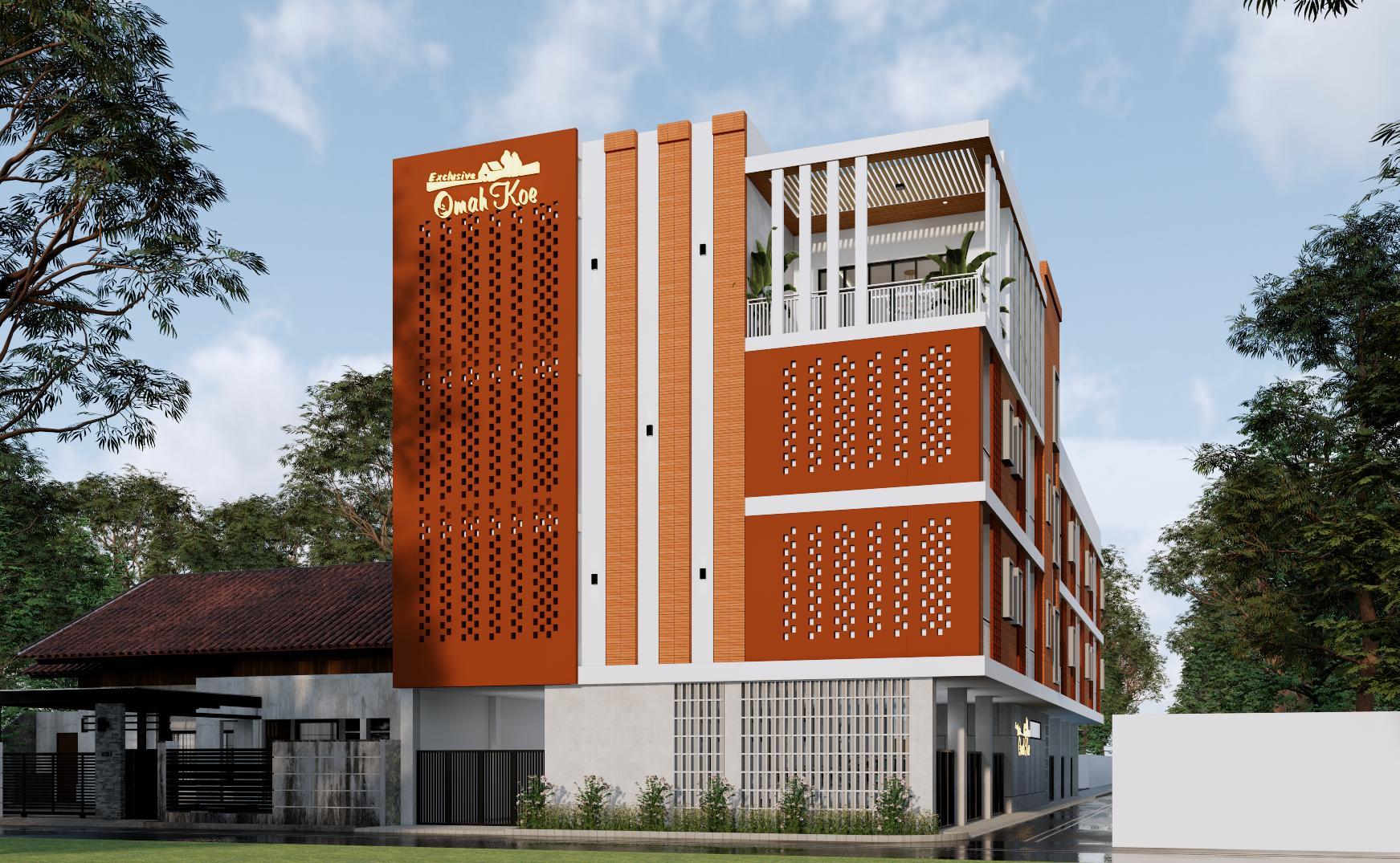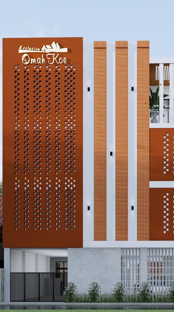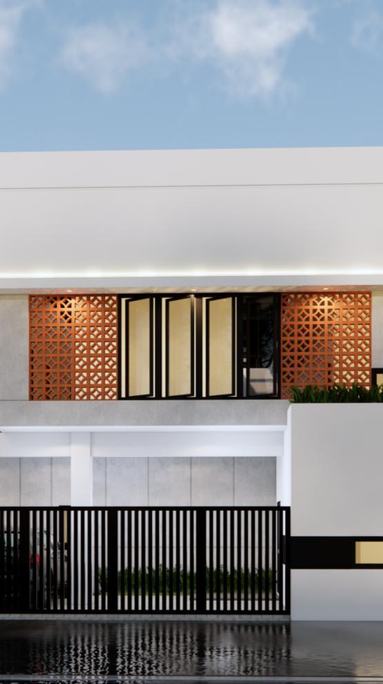 Thisboardinghousefeaturesamoderntropical style with a clean and bold look.The red brick lattice (roster) on the upper floor adds a unique accent while allowingnatural ventilation.