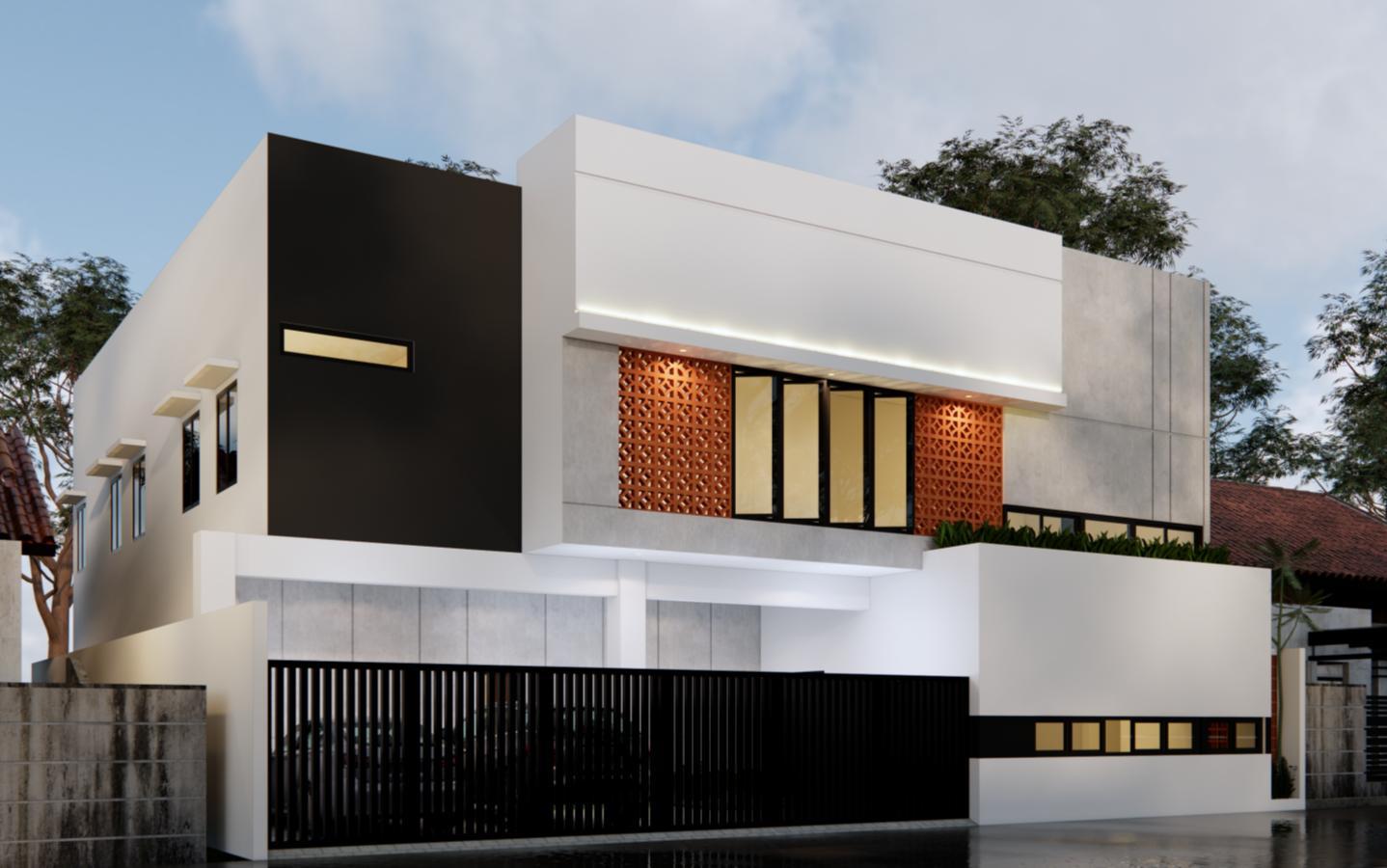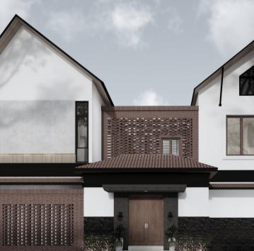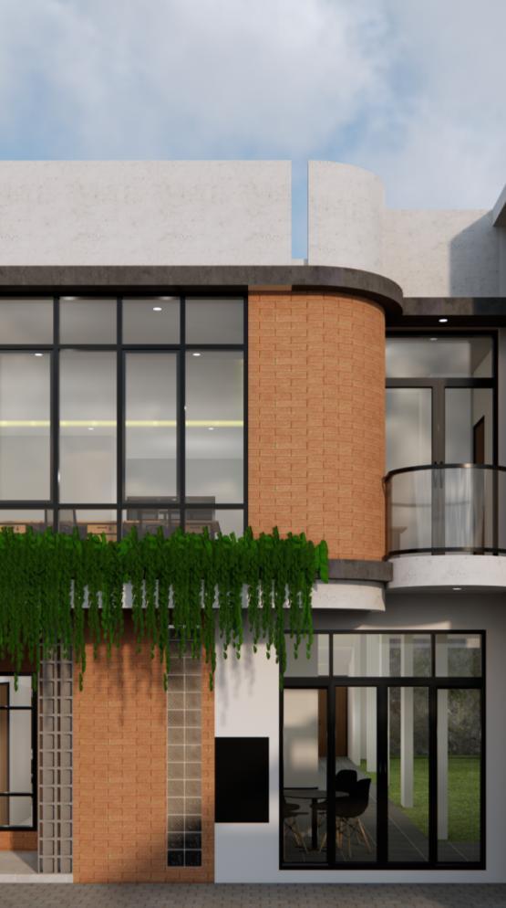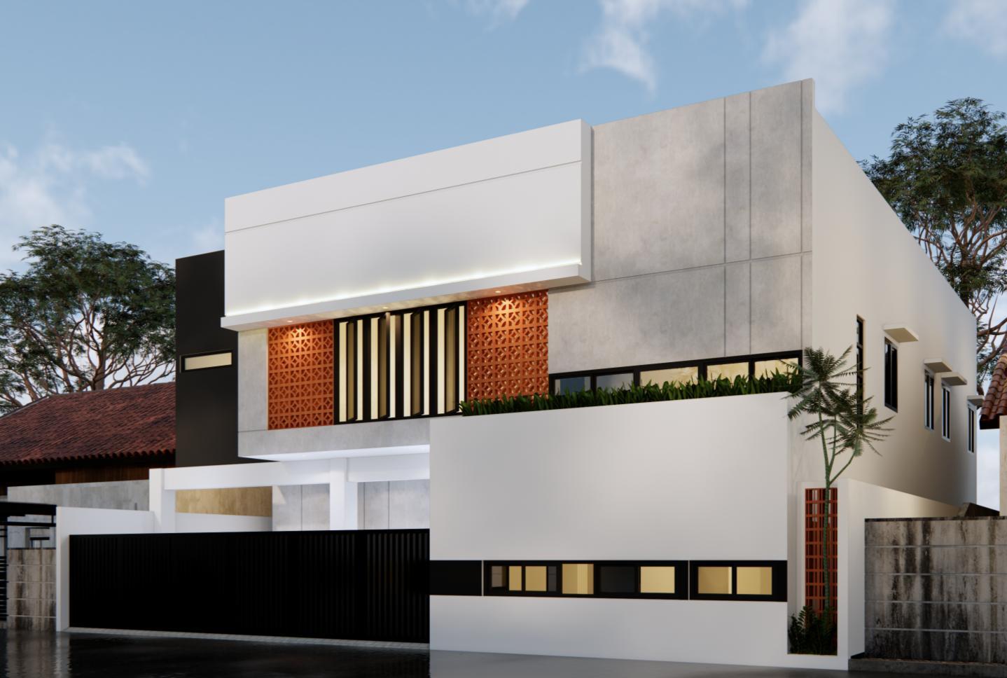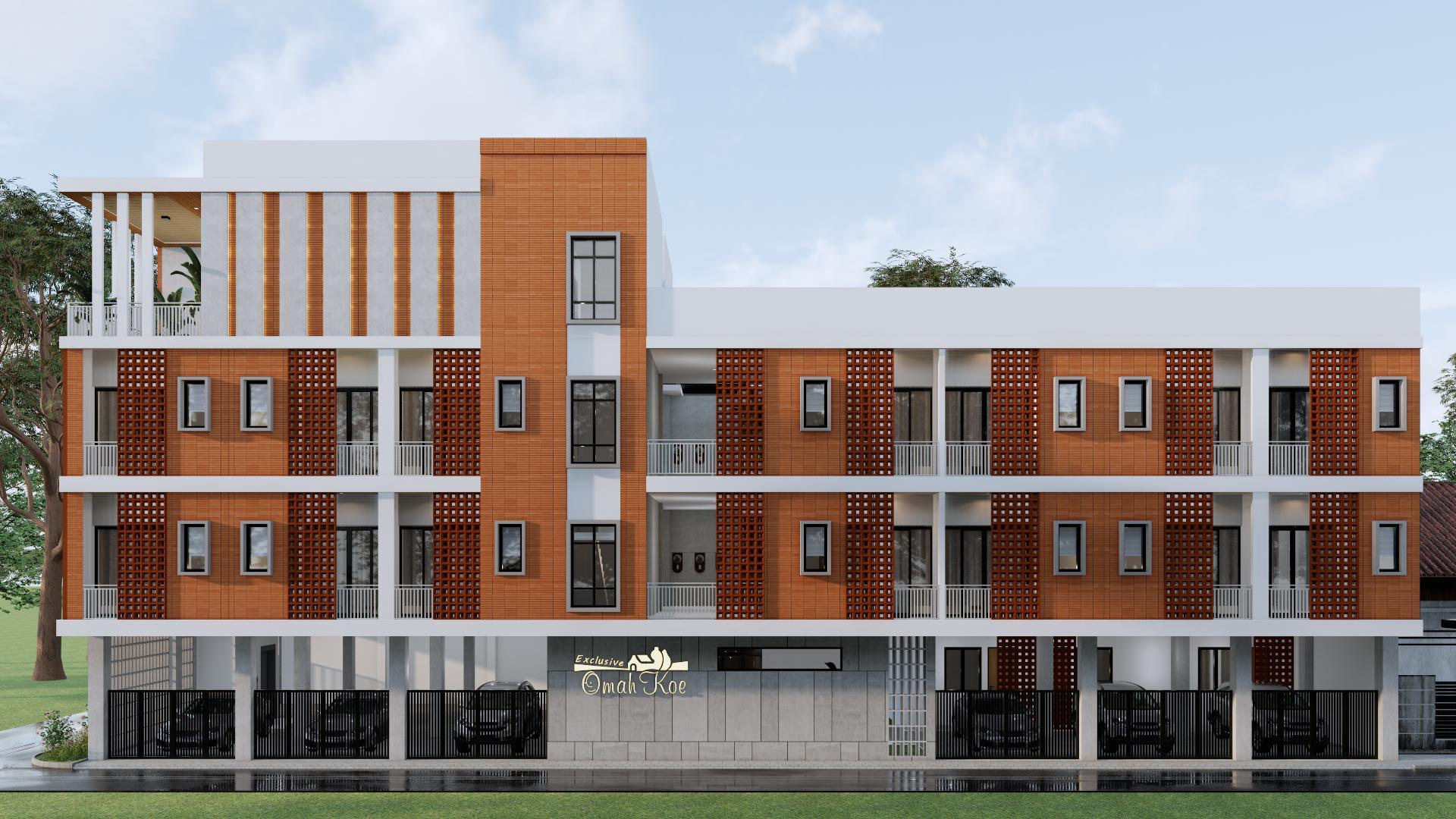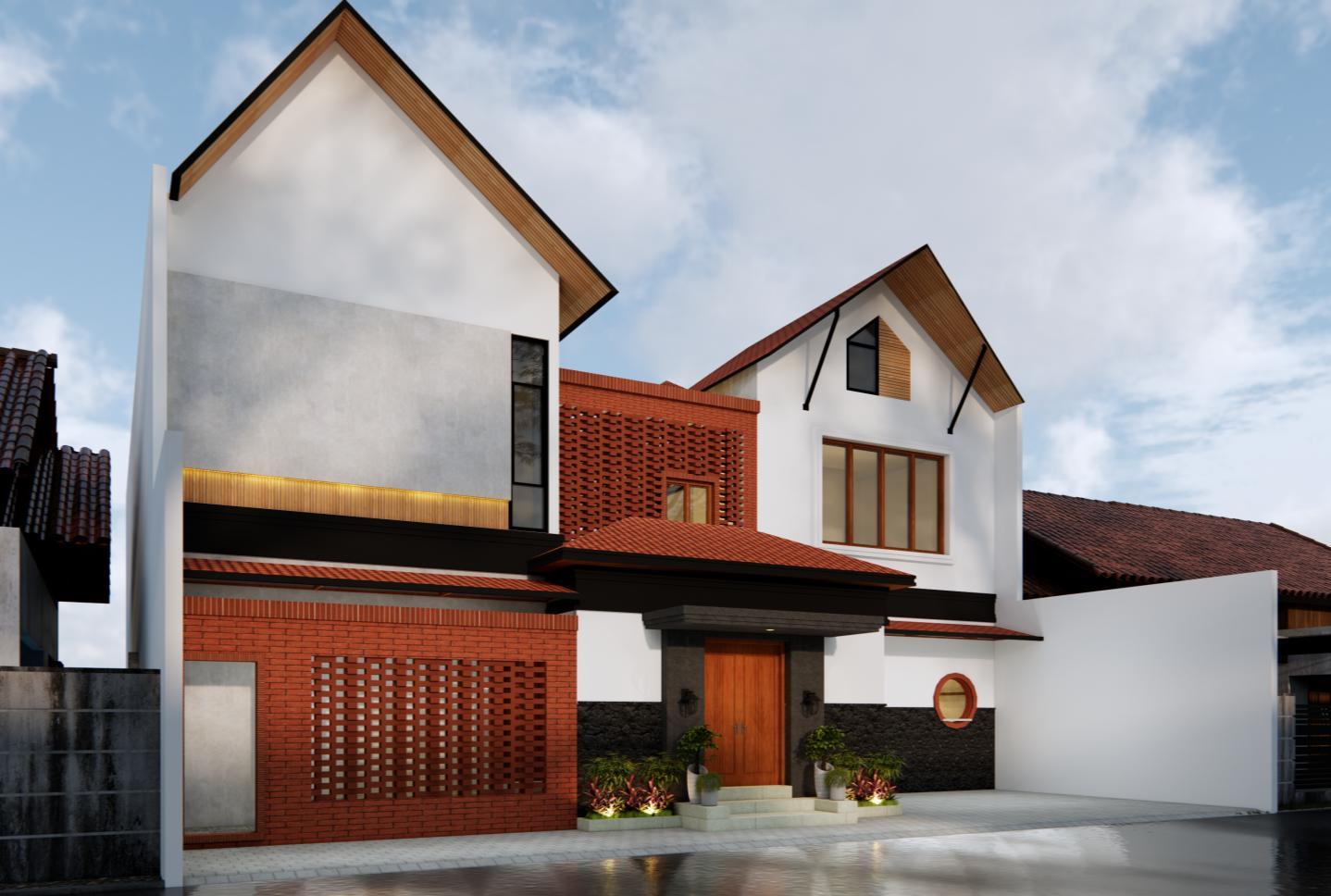 Thisboardinghousefeaturesamoderntropical style with a clean and bold look.The red brick lattice (roster) on the upper floor adds a unique accent while allowingnatural ventilation.