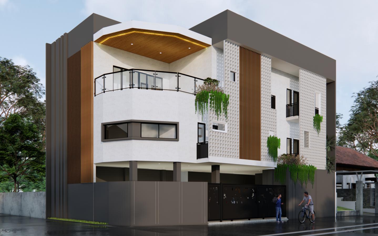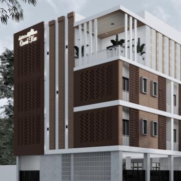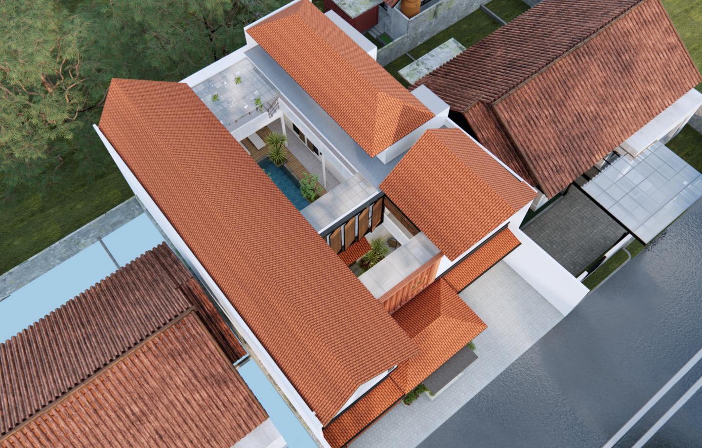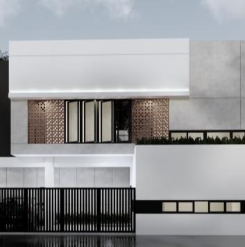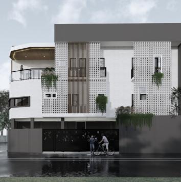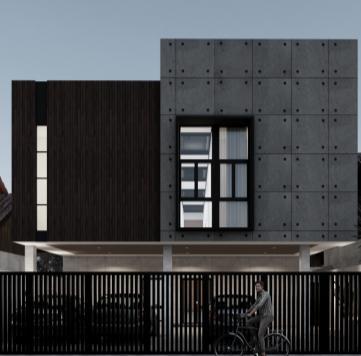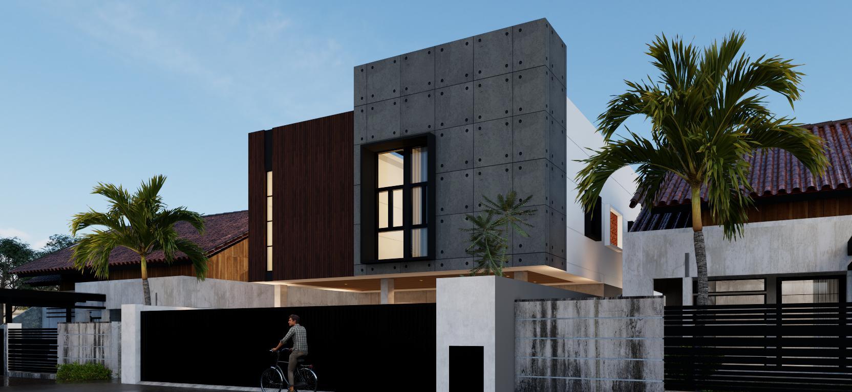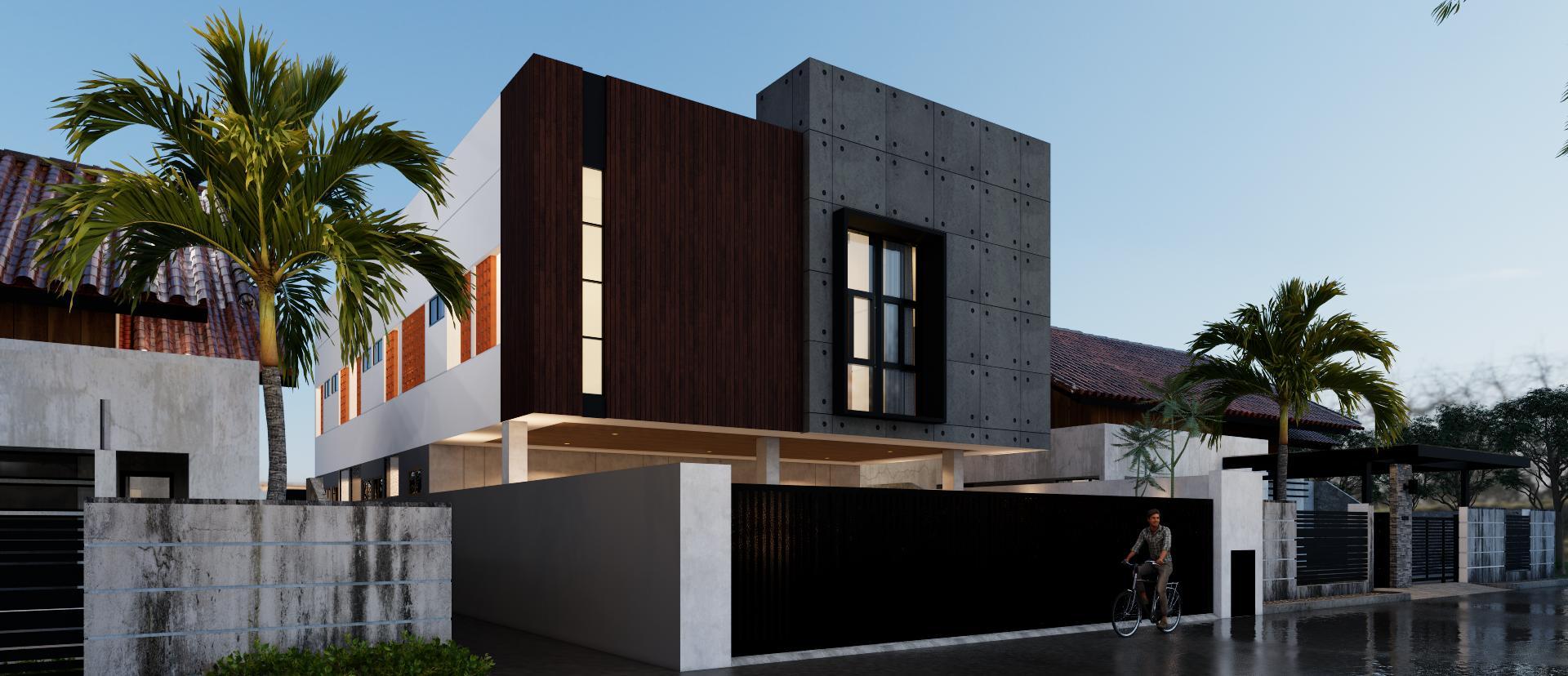 Thisboardinghousefeaturesamoderntropical style with a clean and bold look.The red brick lattice (roster) on the upper floor adds a unique accent while allowingnatural ventilation.