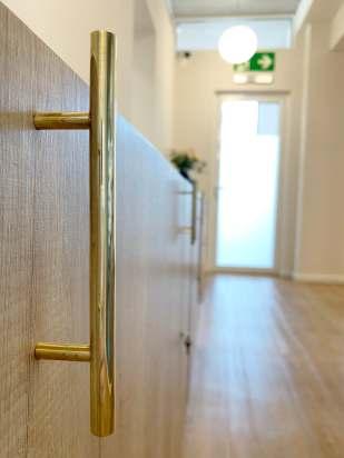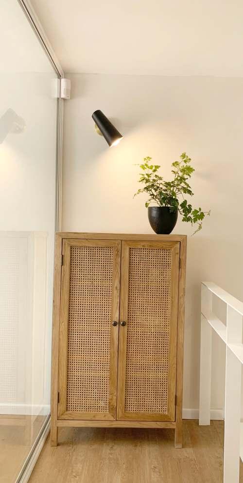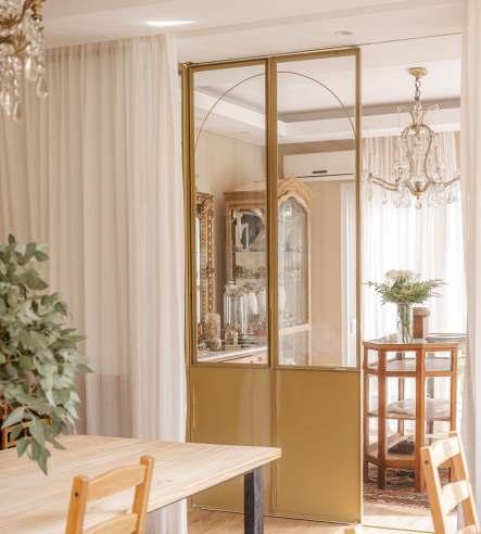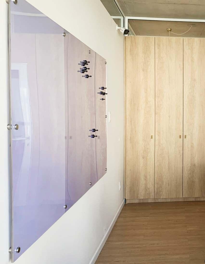 El otro cerramiento funciona como una gran puerta para acceder al sector de almacenamiento principal, pudiendose abrir al 100% y quedar conectado completamente al taller cuando sea necesario. Este cuenta con espejos que ayudanadarmayoramplitudyluminosidadalespacio,alavezquerespondena unanecesidadenelprocesodecreación.