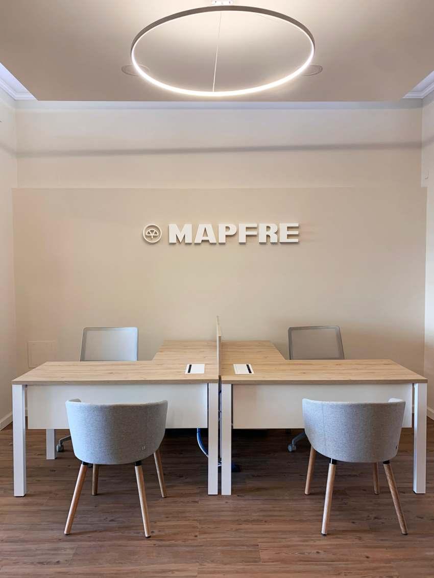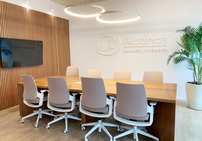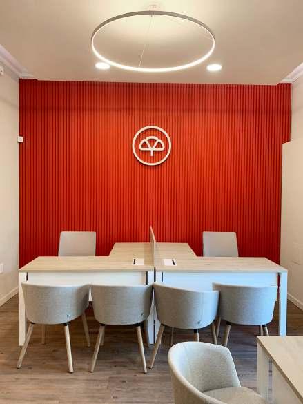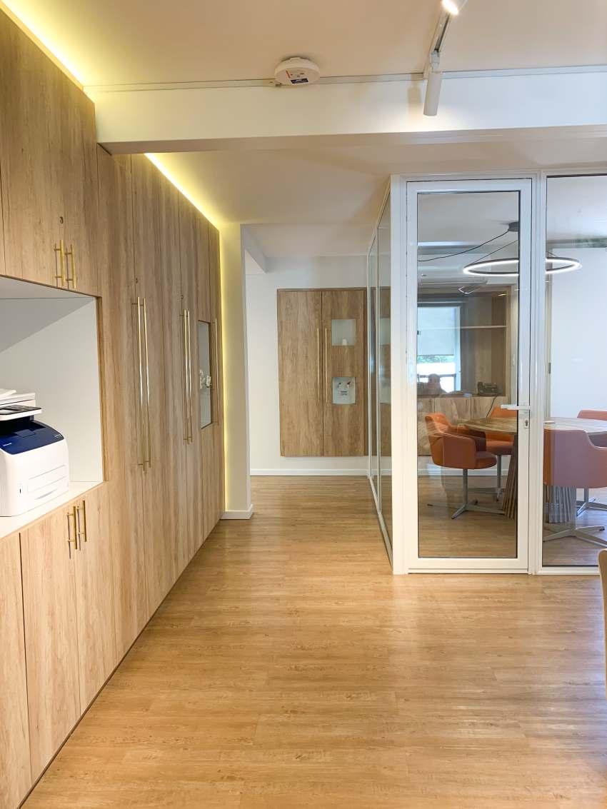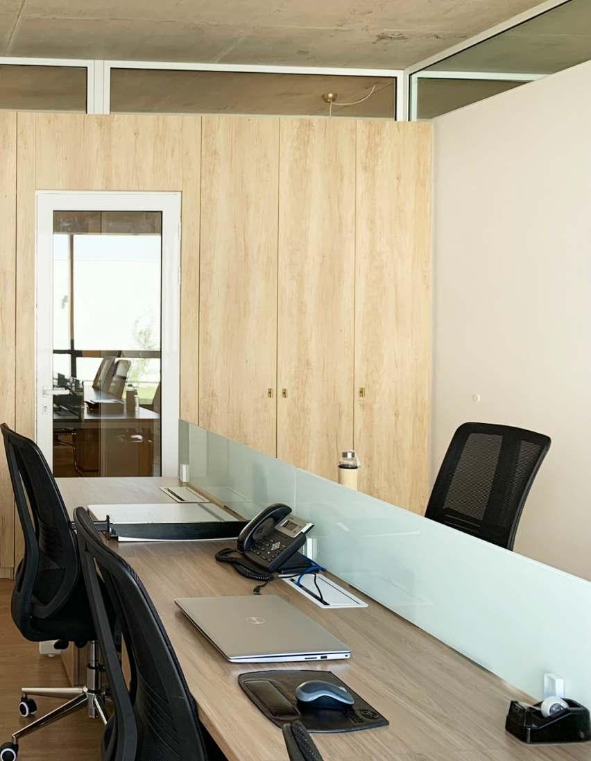 Realizamos la distribución interna contemplando los siguientes espacios de trabajo; un área común con 8 puestos de trabajo, dos salas de reuniones, un living de espera, una sala de capacitación y un espacio exteriorconbarbacoa.