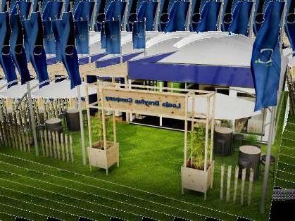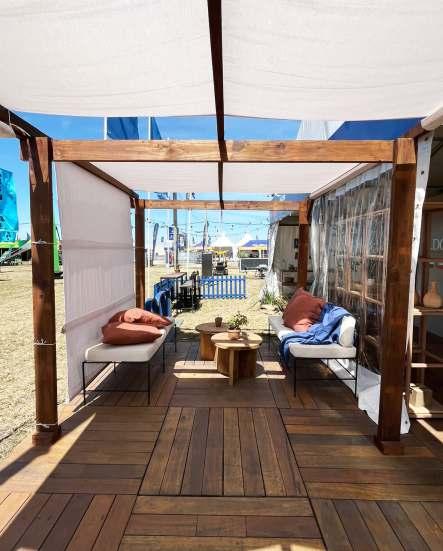 Completamos la estética general y la presencia de marca con toldos, portones, plantasylucesdecorativasmarcandolaentradaysalidadelpabellón.