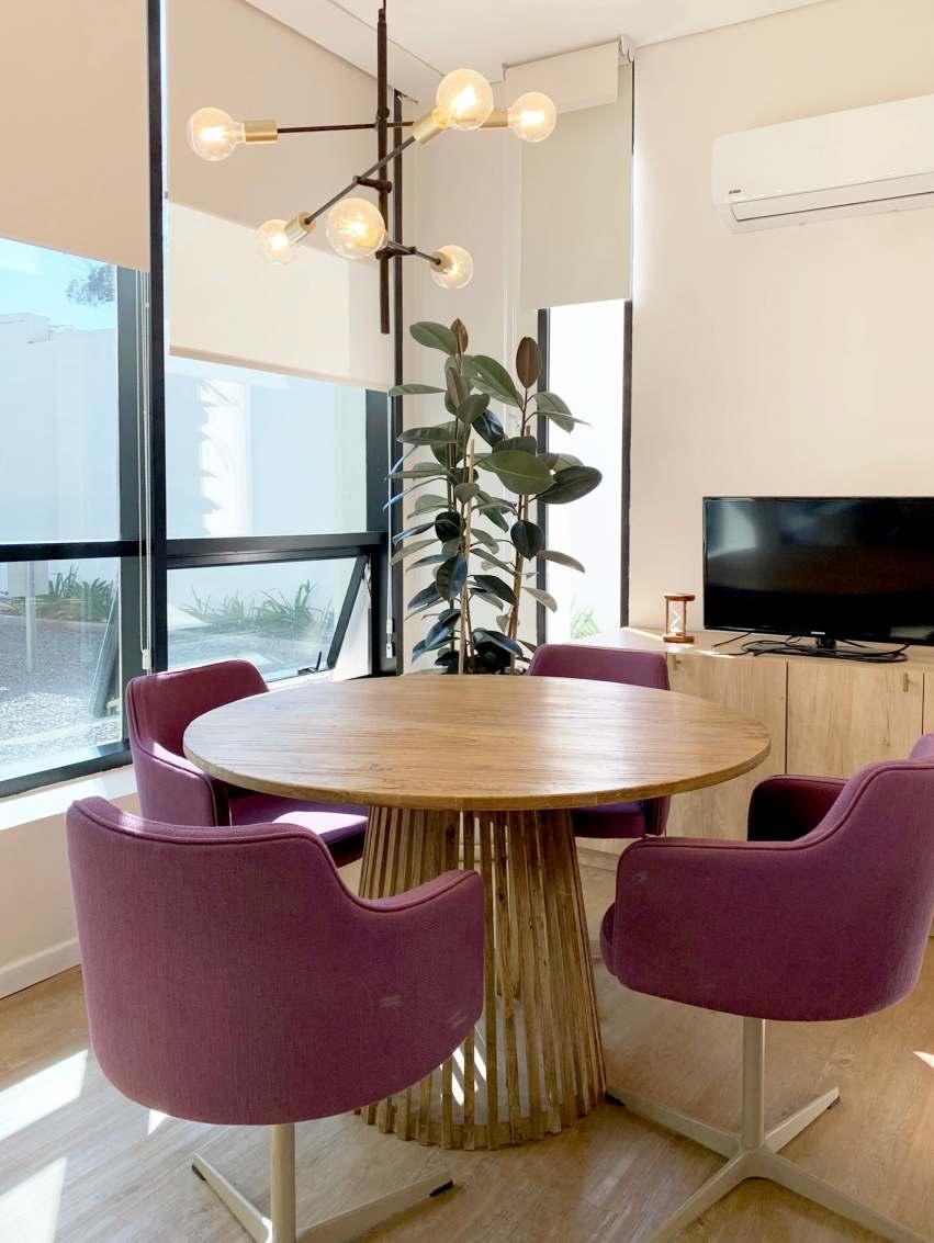 La distribución del espacio la realizamos teniendo en cuenta el nuevo mobiliario a incorporar junto con el mobiliario existente. Seleccionamos los antiguos muebles a reutilizar, los mismos se restauraron y aclararon para darles un aspecto más modero e integrado. Se incorporó ademas mobiliario y elementos decorativos (alfombras, espejos, arañas, etc) que se consiguieron en casas de remate. Dentro del mobiliario a medida realizamos una mesa de trabajo quecontemplaunabachayanafeocultos.