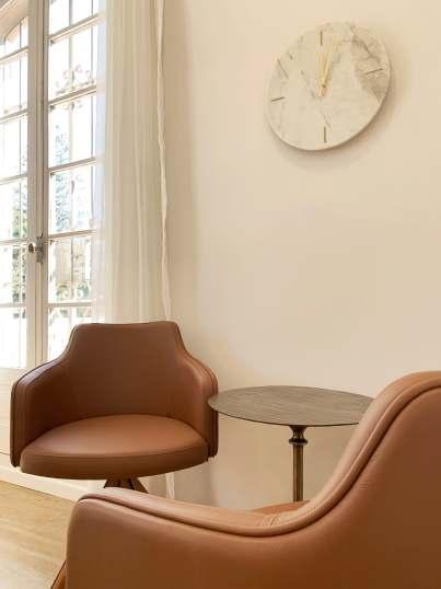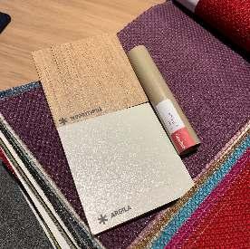Utilizamos planos en tonos neutros y cálidos, algunos de ellos con texturas o tonalidades más fuertes, en contraste con el color Rojo que aplicamos para la pared institucional. El antiguo pavimento negro de la casa lo sustituimos por un piso vínilico simil madera color claro dando continuidad y claridadatodoelespaciodeplantabaja.Enplantaaltautilizamoselmismopavimentopararemplazarlosambientesqueteníanmoquette.