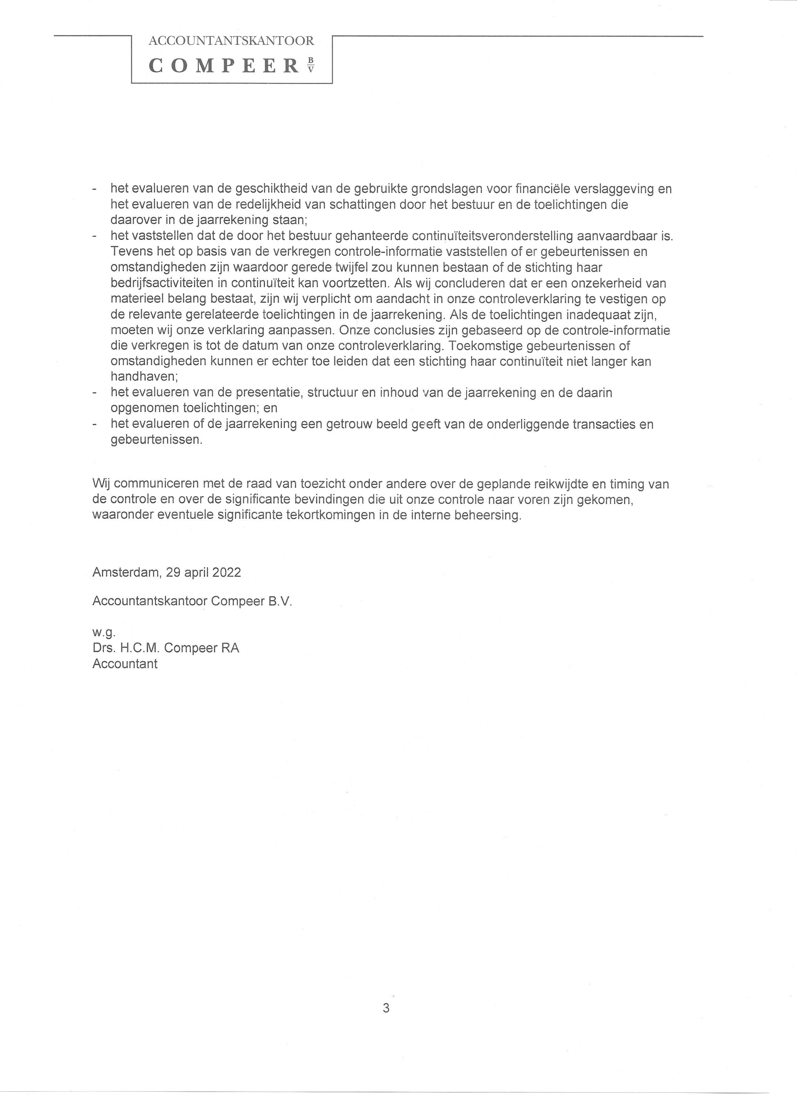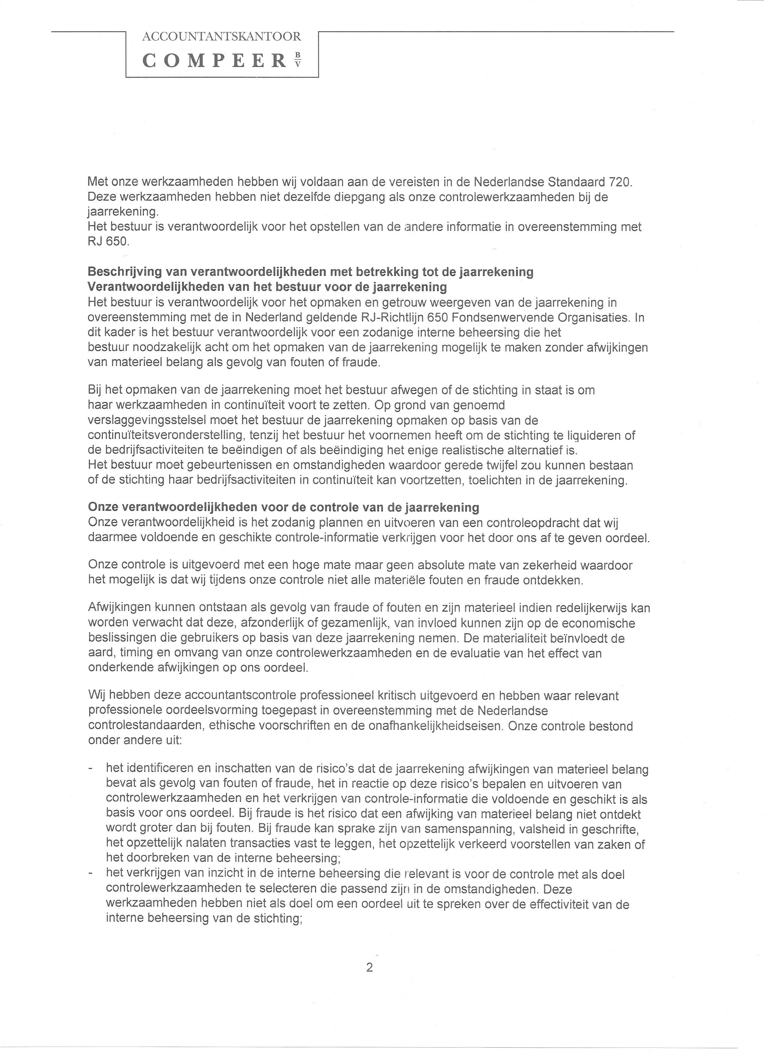 De auditcommissie heeft in dat kader met de directeur van de stichting en met de externe accountant periodiek overleg. Ze informeert de Raad van Toezicht over haar bevindingen.
