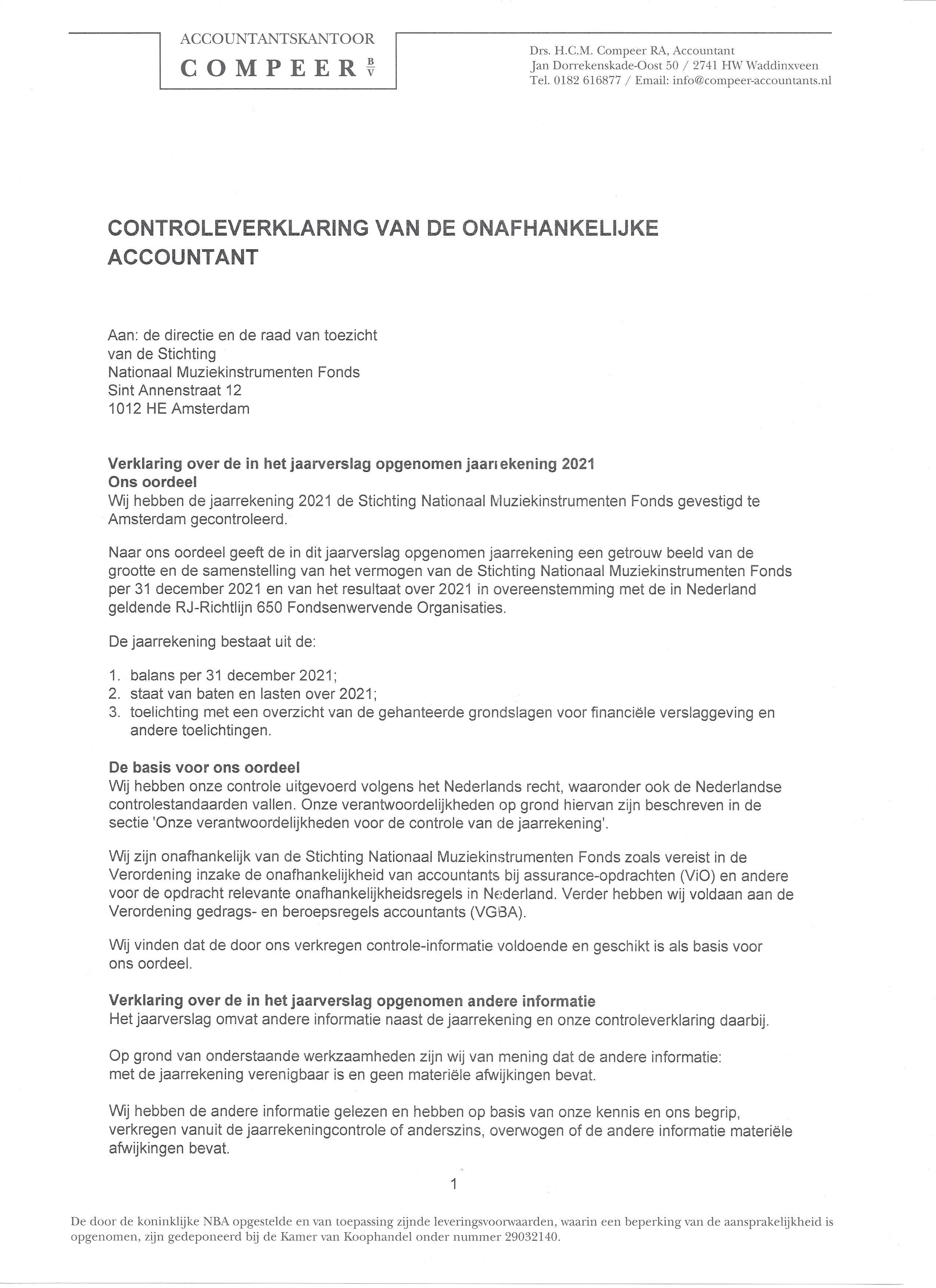 *1 Omdat de concertzalen, podia en theaters hun deuren wegens Covid-19 gesloten moesten houden, verkeerden vele musici in financieel zwaar weer. Om de bruikleen voor hen financieel mogelijk te laten zijn heeft het NMF besloten over het eerste kwartaal van 2021 geen bruikleenvergoeding in rekening te brengen. Het niet in rekening gebrachte bedrag was € 50.000. Daarnaast is een bedrag van € 14.500 aan verzekeringspremies in mindering gebracht en een bedrag van bijna € 25.000 korting verleend ten laste van het NMF Steunfonds.
