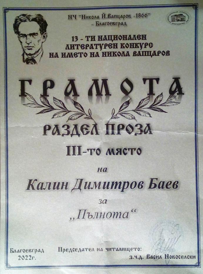 по левче, при което показа портфейла си. Беше празен. За разлика от душата му... * Разказът е спечелил трета награда в конкурса на името на Никола Вапцаров, раздел „Проза“ гр. Благоевград Калин Баев