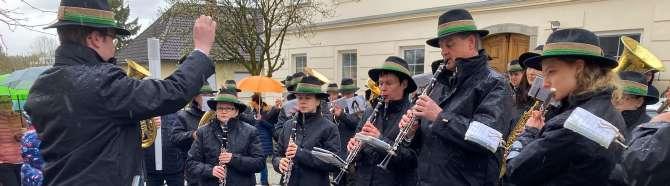 Leider war am Palmsonntag das Wetter zu schlecht und so fiel die Prozession ins Wasser. Die Palmweihe fand daher am Kirchenplatz statt. Wir Musikerinnen und Musiker trugen an diesem Tag erstmals unsere neuen schwarzen Jacken.