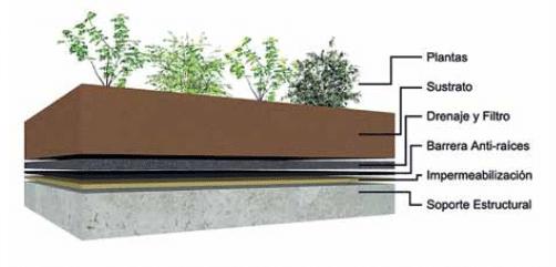 Se implementa una cubierta verde extensiva de 15 cm de espesor del sustrato.