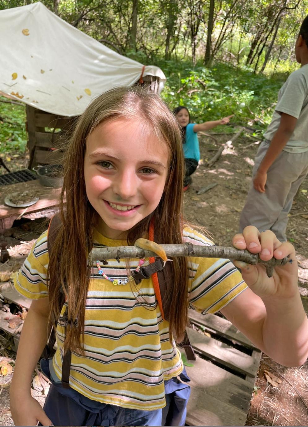 At this age, students are emergent writers and can express themselves through nature drawings and journaling. Fine motor activities such as weaving vines, picking up bugs with utensils, and creating art in the mud all strengthen their hands and improve their pencil grip. They connect to nature by observing plants and animals during their free exploration time and in different mindfulness practices.