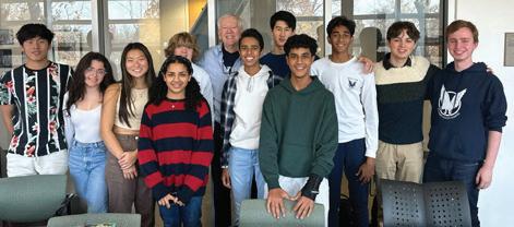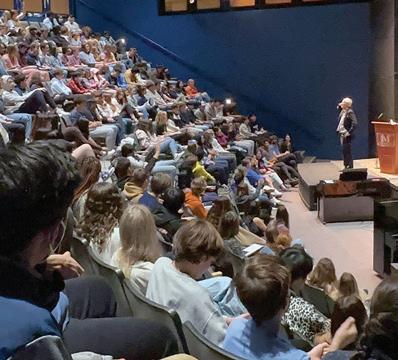 Mr. Chapman (back row), with honoree Alex Ni ‘24 (to his left), hosted a lunch for nearly a dozen seniors during his campus visit. At right: Mr. Chapman shares his wisdom with an assembly of Upper School students.
