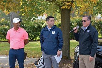 Top: Milton Carswell Jr., coach of the MV golf team and PGA Golf Pro at Stone Oak Country Club, and MV’s Christopher Holinski listen as Chad Baker welcomes golfers. Right: Mr. Baker and wife Eileen Sullivan.