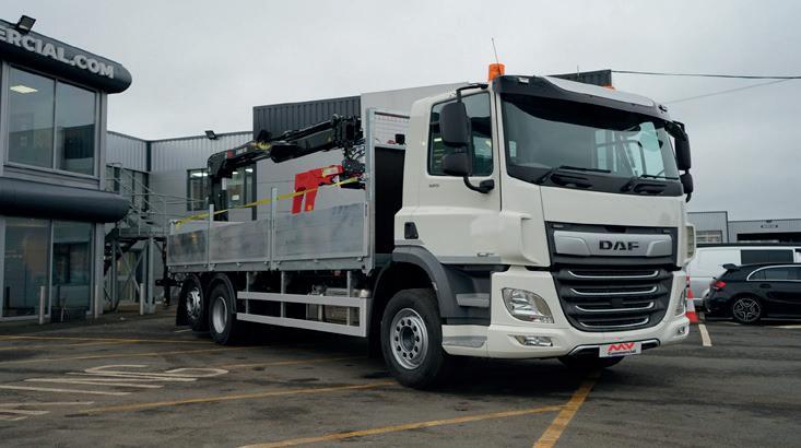 FLEXIBLE FINANCE PACKAGES AVAILABLE • FULL BLASTING & PAINTING CRANE TRUCKS G458634 530bhp, 65t, 6x2 Tag Axle, XG Cab, Auto, Air Con, Double Bunk, Cab Heater, MX Engine Brake, Exhaust Brake, ZF Intarder, DAF Digital Vision System, Vision Window, HIAB 858 Crane with 6 Ext & Radio Remote. EURO 6 2024 DAF FTN XG530 6X2 65T | HIAB 858 510bhp, 80t, Tag Axle, Space Cab, Manual, Air Con, Single Bunk, Beacons, Camera System, Fixed 5th Wheel, Fitted with a PM65026 Crane with 6 Ext & Radio Remote. 80T 2017 DAF XF 510 TRACTOR | PM 65 EURO 6 LK67LGJ 480bhp, 32t, 8x2 Rear Lift & Steer, Space Cab, Automatic, Air Con, Cheesewedge Body, Fall Arrest System, Single Brake, Winch, Toolbox, MX Engine Brake, Palfinger PK 33 & 22 Available. 32T 2024 DAF XF 480 CHEESEWEDGE | PK 22 EURO 6 G450259 320bhp, 18t, Space Cab, Automatic, 4x2, 5700mm Wheelbase, Air Con, Cab Heater, Single Bunk, Toolbox, 23.6ft Triple Dropside Body, Front mount Hiab 188 B-3 Crane Piped for Attachment. 18T 2023 DAF CF 320 FRONT MOUNT BRICK GRAB EURO 6 G402754 460bhp, G-Sleeper Cab, Auto, 8x2 Rear Lift & Steer, Air Con, Single Bunk, XT Pack, Night Heater, Beacons, 25ft 4” with 6ft Pull Out Cabin Spec with Fall Arrest or Cheesewedge Body, Palfinger PK 62 with 6 Ext & Radio Remote. 32T 2024 SCANIA G460 CABIN | PK 62 EURO 6 9331825 320bhp, 26t, Day Cab, Auto, 6x2, Air Conditioning, Triple Aluminium Dropside with Fall Arrest, Wisadeck Floor, Reverse Beeper, Large Toolbox, Advert Board, Rear Mount HIAB 158B-2 c/w Brick Grab. 26T 2024 DAF CF 320 BUILDERS MERCHANT EURO 6 G427254 320bhp, 26t, Day Cab, Auto, 6x2, Air Conditioning, Triple Aluminium Dropside with Fall Arrest, Wisadeck Floor, Reverse Beeper, Large Toolbox, Advert Board, Rear Mount HIAB 158B-2 c/w Brick Grab. 26T 2024 DAF CF 320 BUILDERS MERCHANT EURO 6 G463590 LIFTS 1,995KG @ 10.69M • 320bhp, 18t, Space Cab, Auto, 4x2, 6600mm WB Air Con, Single Bunk, , 23.6ft Flatbed Body with Fall Arrest, Stainless Steel Toobox, Hiab 188 B-3 Crane Remote, Piped for Attachement. 18T 2023 DAF CF 320 FLATBED | HIAB 188 EURO 6 G396351 450bhp, 26t, 6x2 Rear Lift & Steer, Space Cab, Auto, 6100mm Wheelbase, Air Con, Beacons, Cheesewedge Body, Fitted with Choice of a Palfinger PK33002 EH C / PK 22002 EH C Crane, 9t Front Axle, Piped for Drawbar. 26T 2024 DAF CF 450 CHEESEWEDGE | PK 33 EURO 6