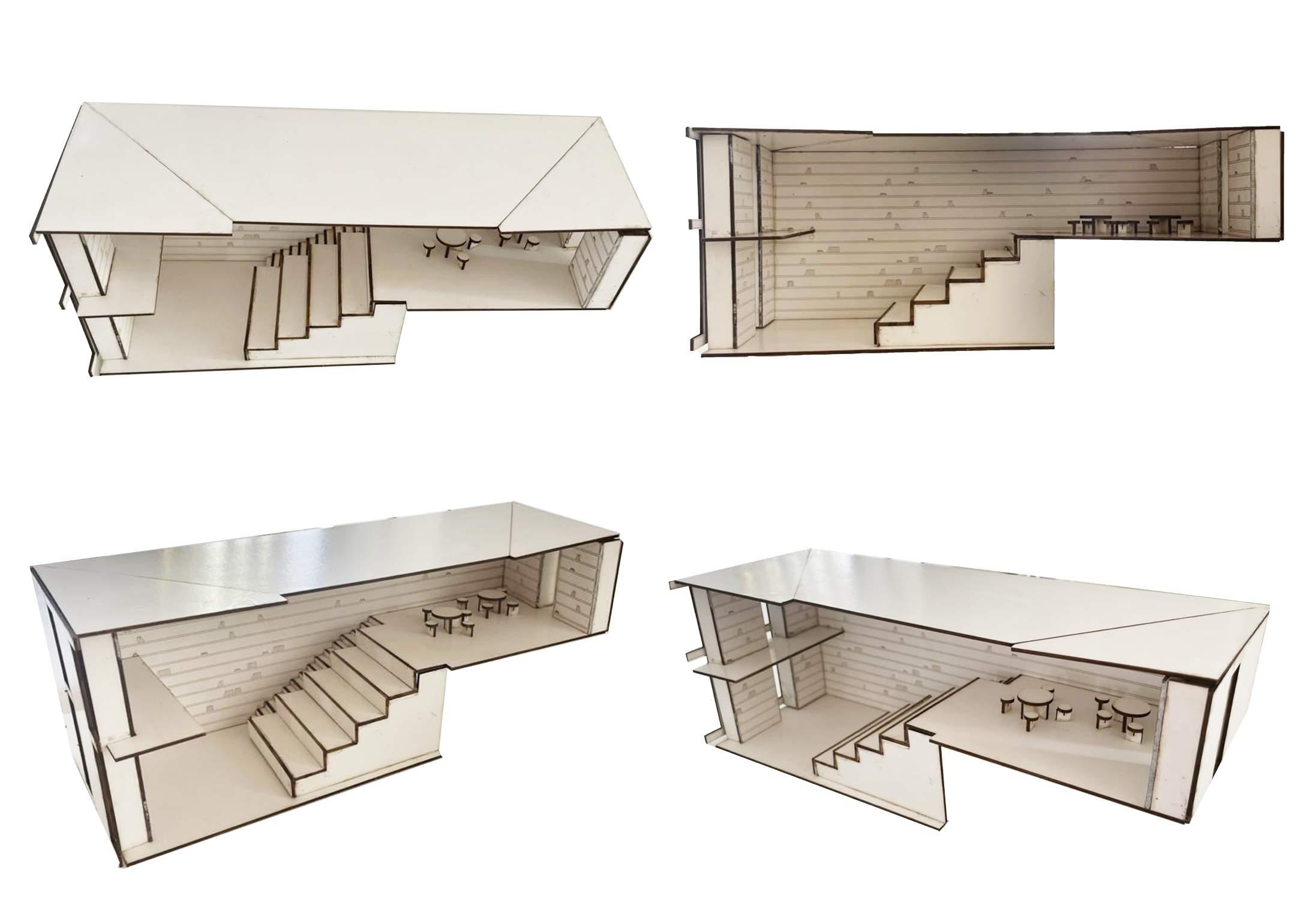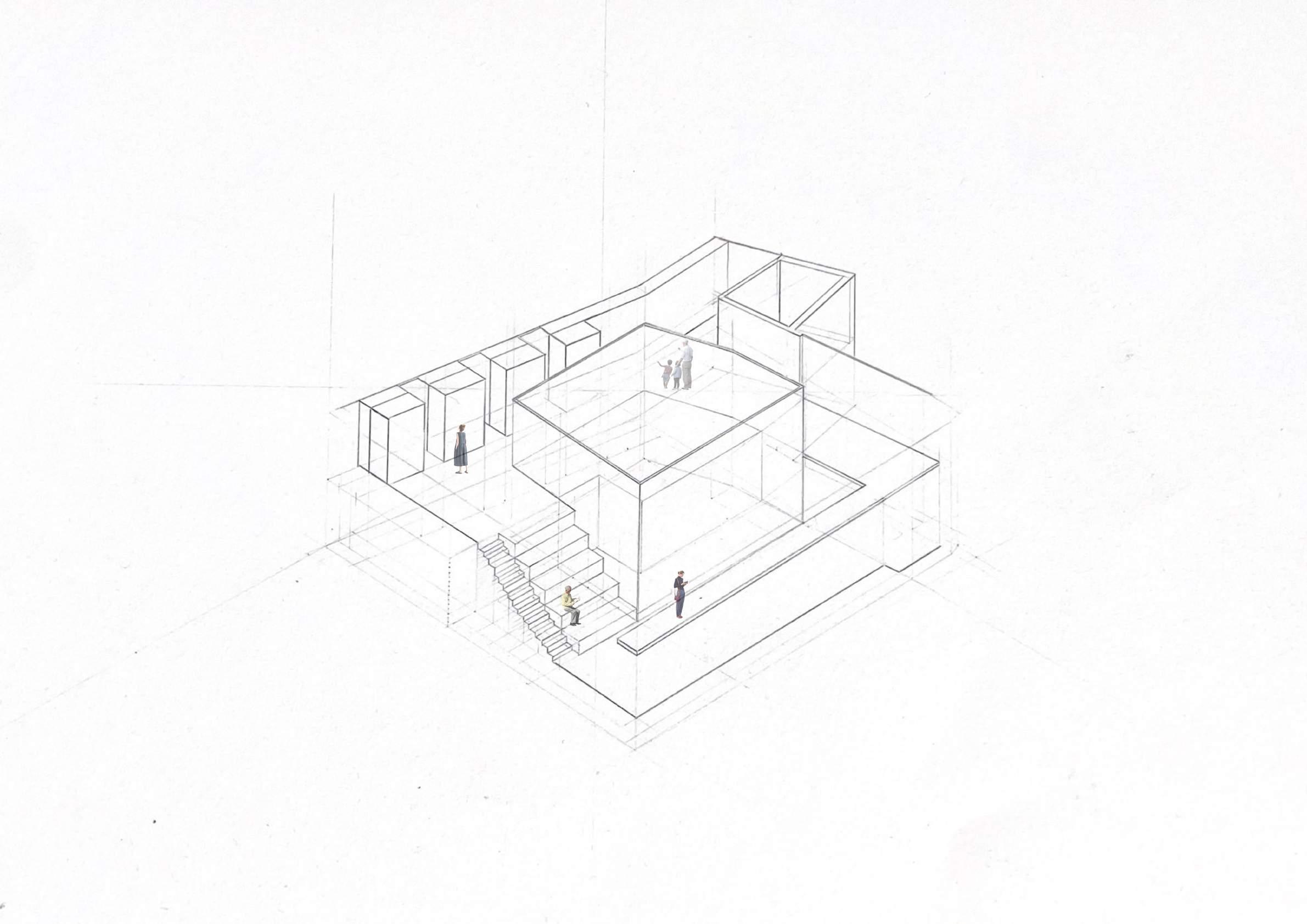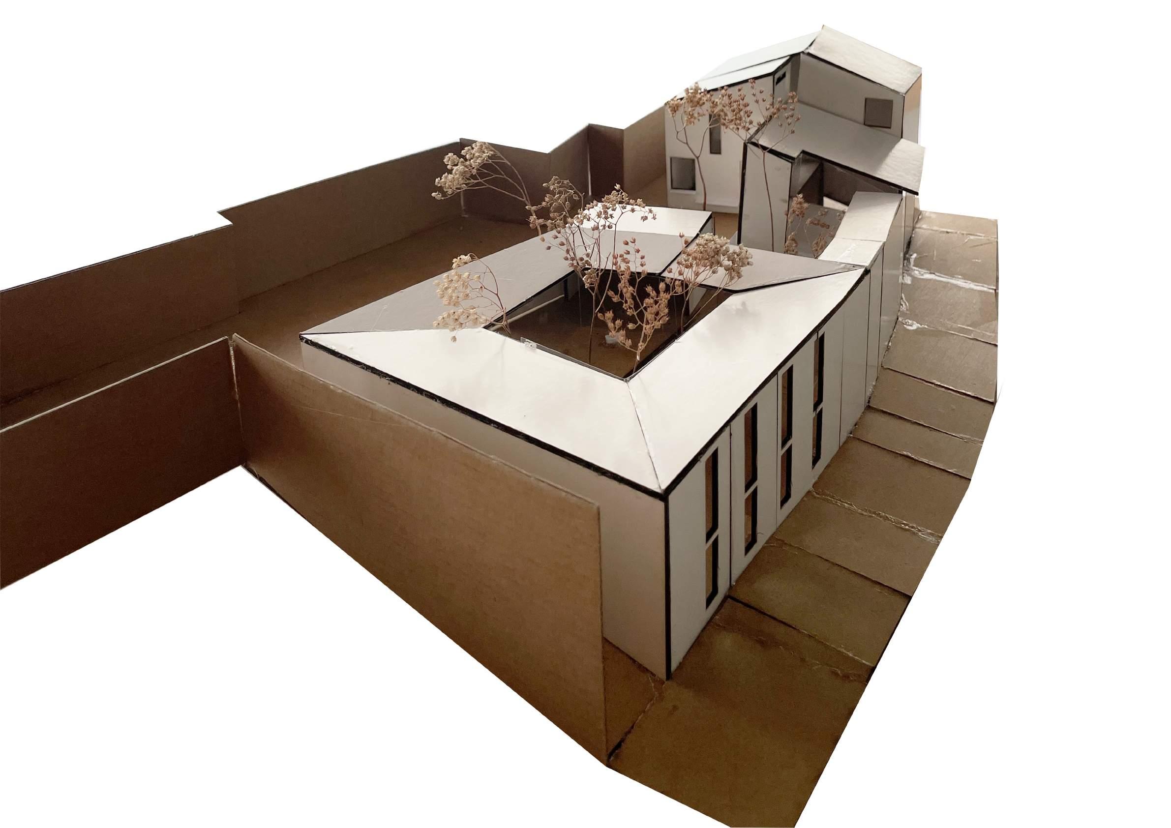 La cubierta de la biblioteca es un impluvium adaptado a nuestra parcela, donde los diferentes aleros se inclinan hacia el interior recogiendo el agua de la lluvia.