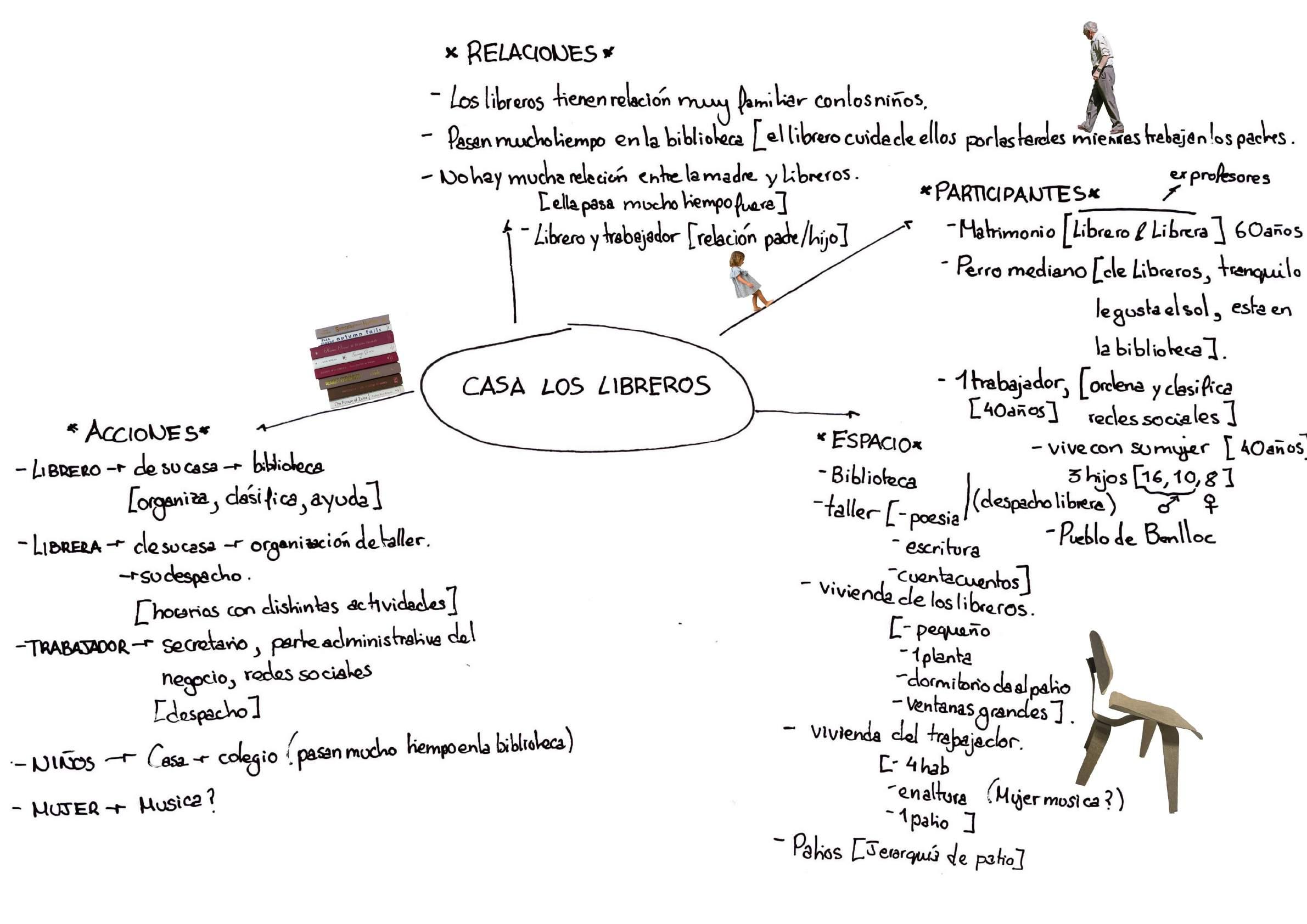Lo que hace de esta parcela una casa son las personas que la habitan, entre ellas están una pareja de libreros de mediana edad los cuales son los dueños de la biblioteca y del taller. Se encargan de dirigir estos espacios y están caracterizados por ser personas muy tranquilas, que disfrutan de un espacio silencioso sin ningún tipo de distracciones. Tienen un perro mayor el cual siempre esta en la zona de la biblioteca descansando.