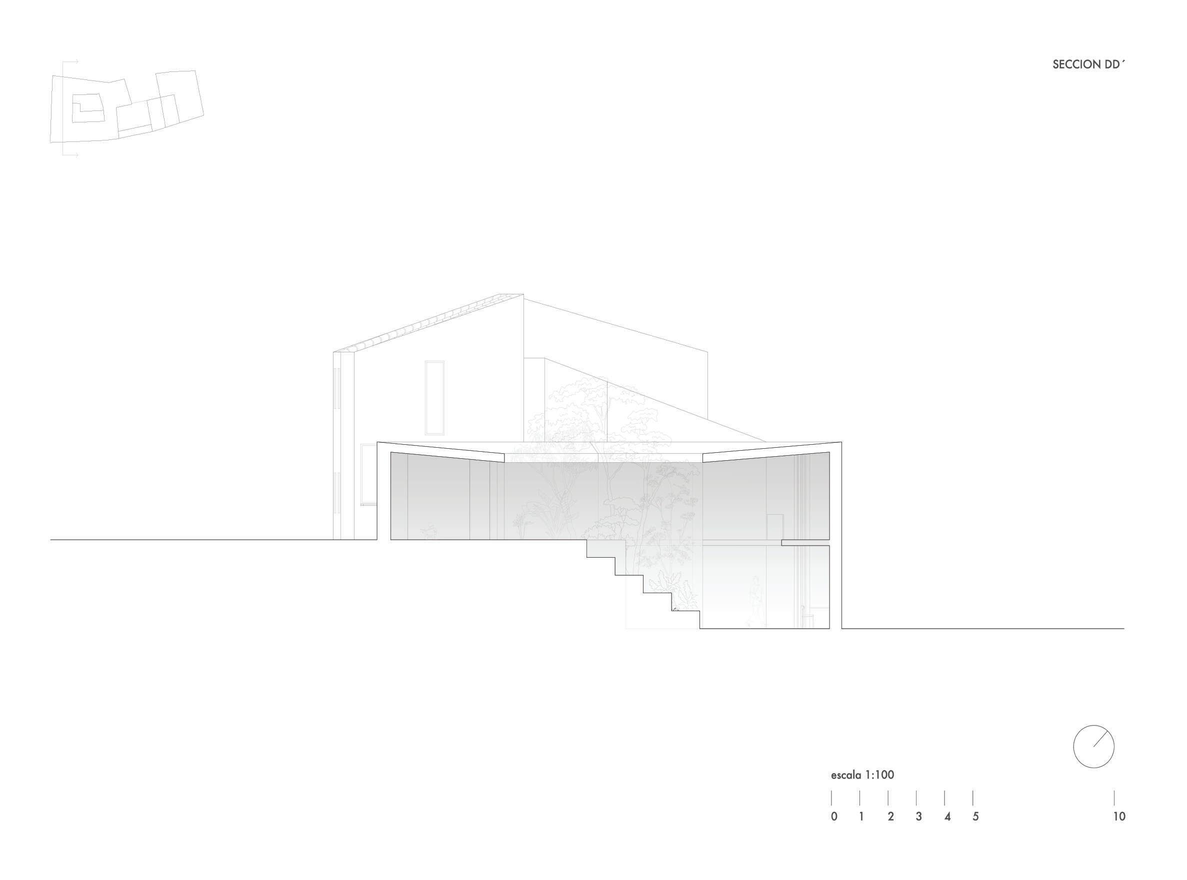 por un modulo central que separa todos los espacios sin la necesidad de cerrar ninguno. Esta vivienda da únicamente al patio más privado para conseguir esa privacidadescalera.