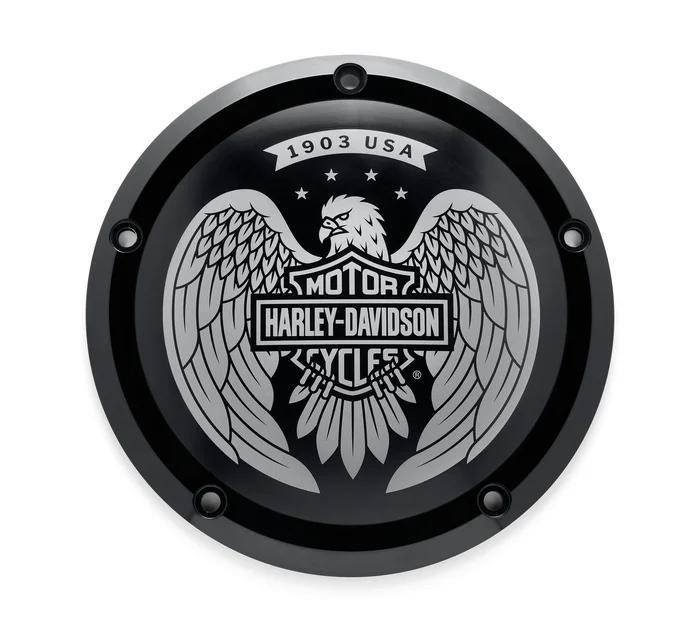 INSTOCKONLY $222 H-D® Eagle Bar & Shield Derby Cover SUMMERROADTRIPPIN' MOUNTAINVIEW HARLEY-DAVIDSON® Twoiconicsymbolsoffreedomandstrengtharecelebratedinthisstunning decorativecomponent.AstylizedeagleandtheBar&Shieldlogoarelaseretched inblack-anodizedbilletaluminumtoachievebrillianthighlightswithsharp detail.