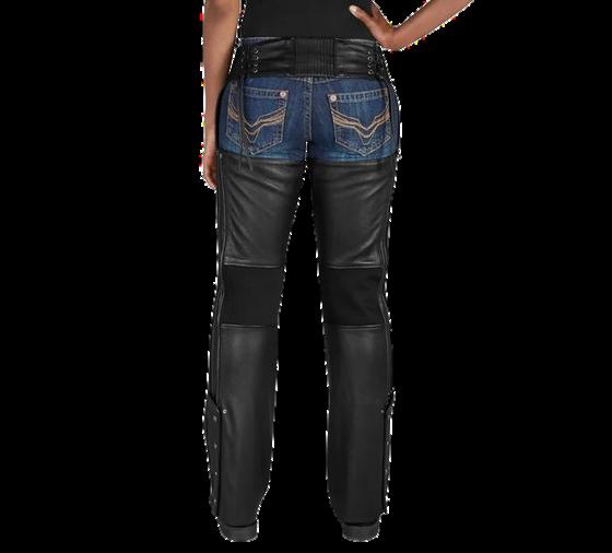 INSTOCKONLY $439 H-D® Women's Deluxe II Leather Chap Chapsthatfitlikeaglove.Withpower-stretch,lacing,stretchthigh/knee, cuttablehem,ANDdualzip,theDeluxeIILeatherChapoffersacustomfit. Graphicsonthesewomen'smotorcyclechapsareintentionallyminimalto coordinatewithanyjacket.