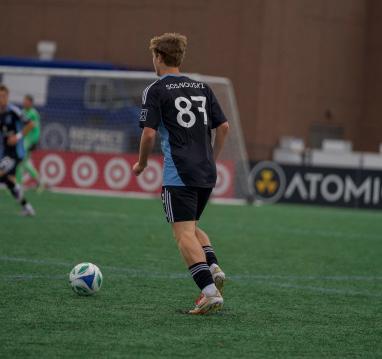 higher level than most kids of his age. He describes how this difference makes it hard for people his age to relate to him just because of the level he is playing at and the settings this puts him in. “It makes me mature, in both the aspect of soccer and off the field. So that definitely helps,” said Sosnouski. Playing for MNUFC2 means that his teammates are much older than he is, with many in their 20s while he is still a sophomore in high school.