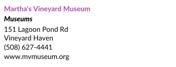 Next make your way to the stunning Martha’s Vineyard Museum located on Lagoon Pond Road, offering a gorgeous view of the VineyardHavenHarbor.Thisstate-of-the-artmuseumwillinspire you to discover, explore, and strengthen your connections to the Island and its diverse heritage. Enjoy interactive exhibitions, magnificent displays, concerts, talks and so much more -- you'll want to give yourself time to explore. The Museum is open yearround, but please visit the website for hours, events and general informationmvmuseum.org.