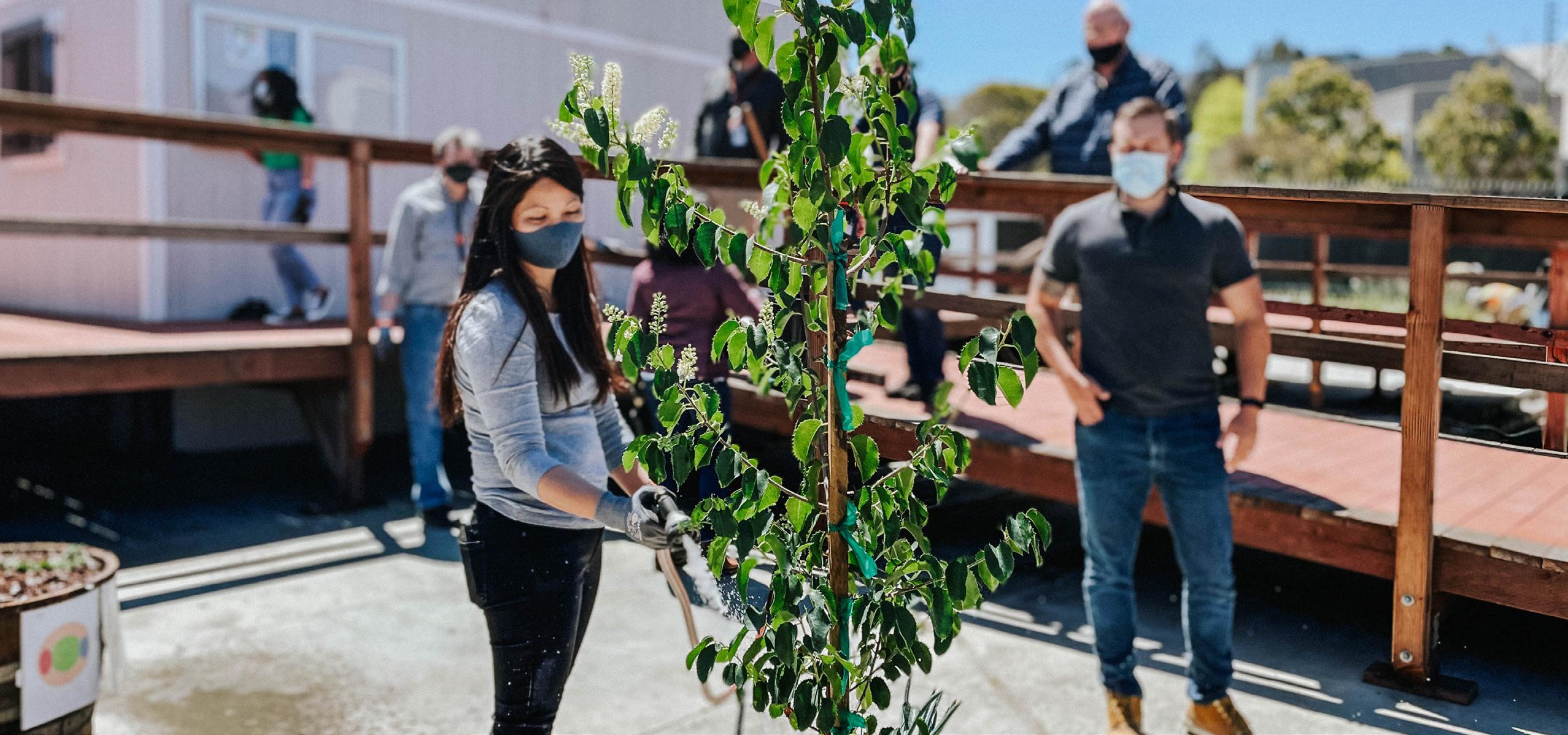Our Biosolids Digester Facilities Project (BDFP) Team in San Francisco recently engaged in a successful team building, tree planting event this April in honor of Earth Month. Five half-wine-barrels of 20 plants sourced from local nurseries in the Bayview of San Francisco were brought on site. The team plans to have these plants be permanent fixtures on site and look forward to watching them grow and flourish as the project progresses. Two of the trees will reach heights of around 25’ at maturity.