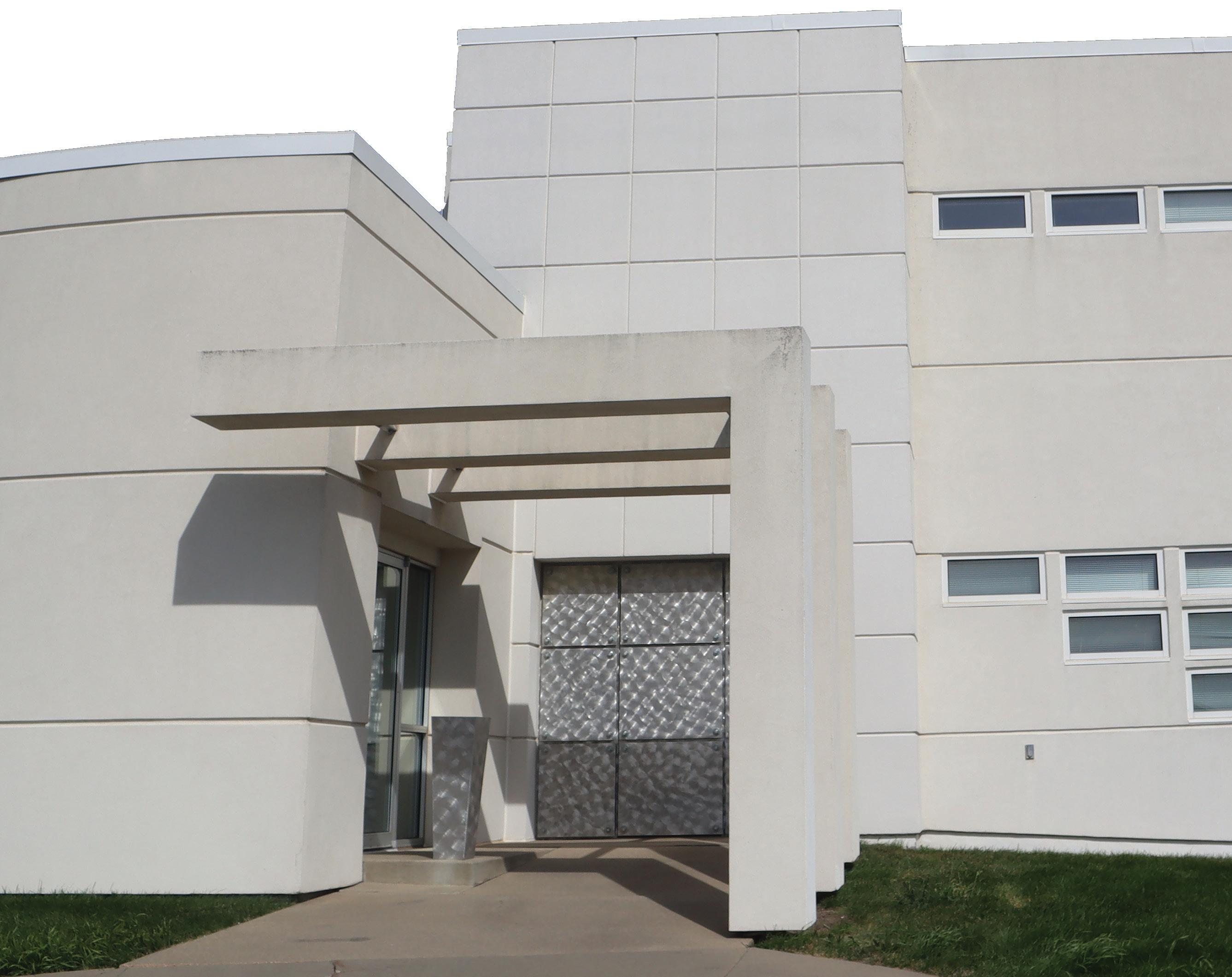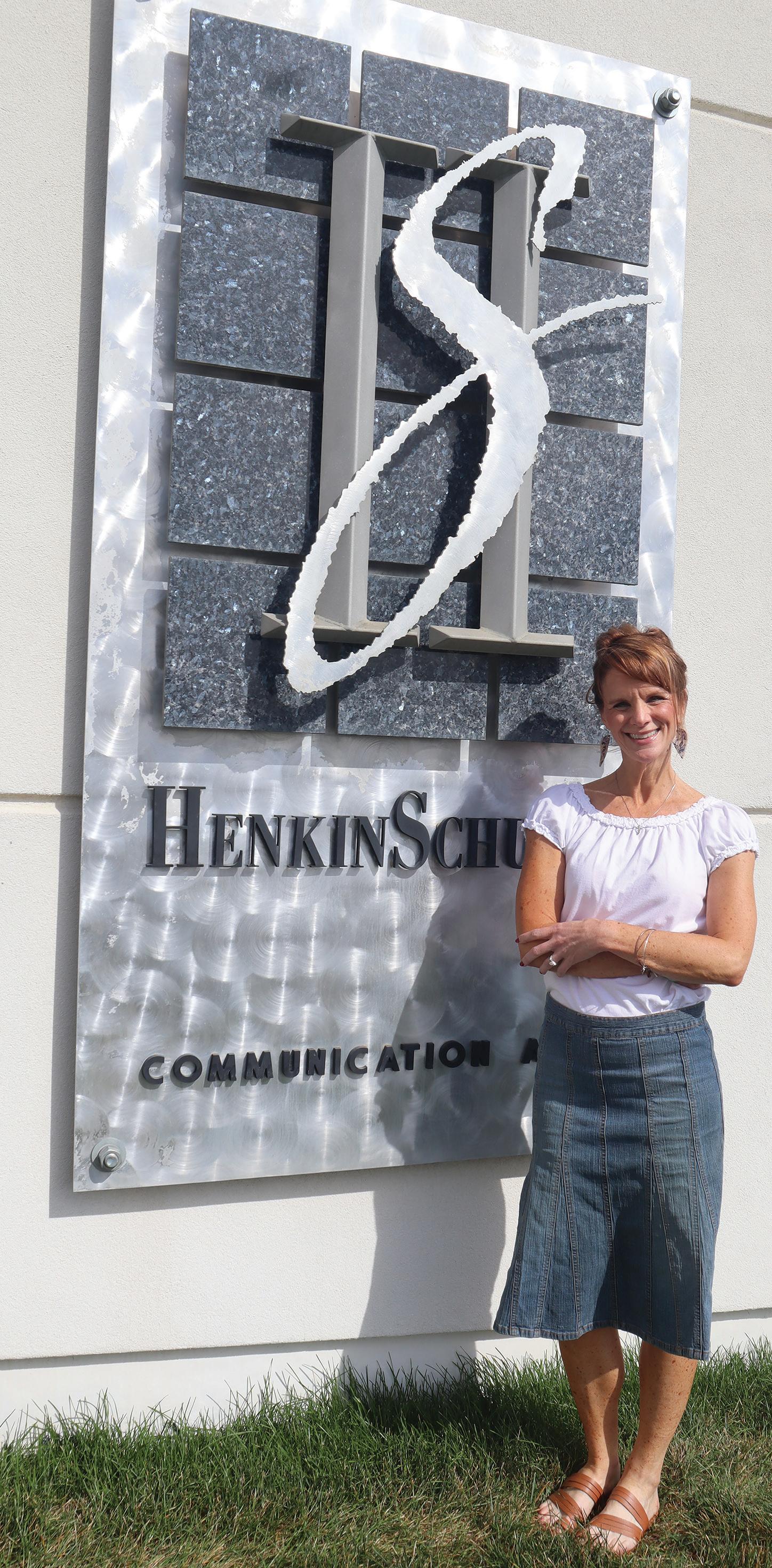 Lynell Weeg in front of the HenkinSchultz Sign on their building