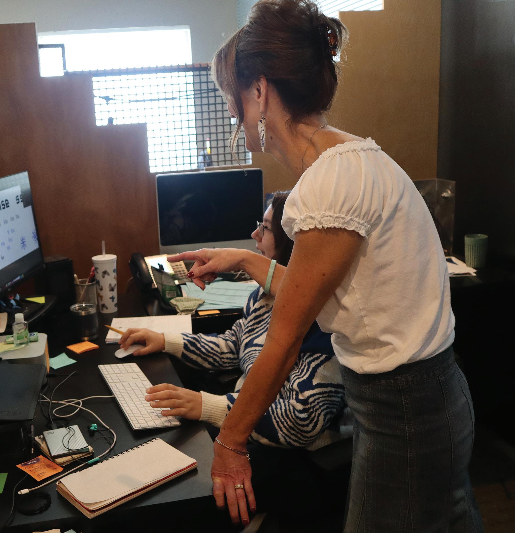 Lynell Weeg overseeing the graphic designer working on a logo.
