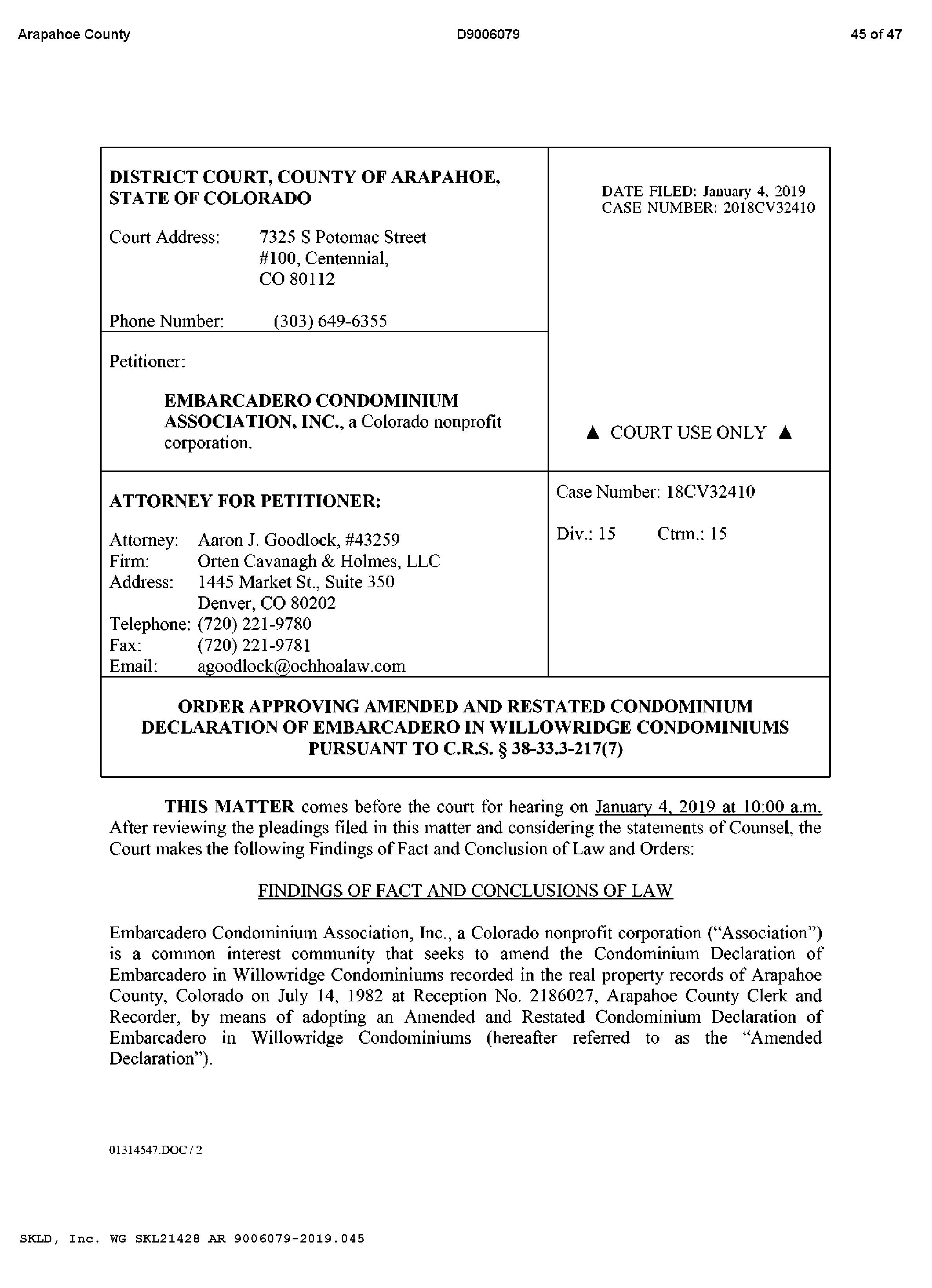 SUBDIVISIONCD 021952 SUBDIVISIONNAME EMBARCADERO IN WILLOWRIDGE BLDGS 41 THRU 53-55-56 BLOCK 045 LOT 00D UNIT D BLDG 45 AS PER CONDO DECLARATION RECORDED IN B 3661 P 145 EMBARCADERO IN WILLOWRIDGE CONDOS 4TH SUPPLEMENT