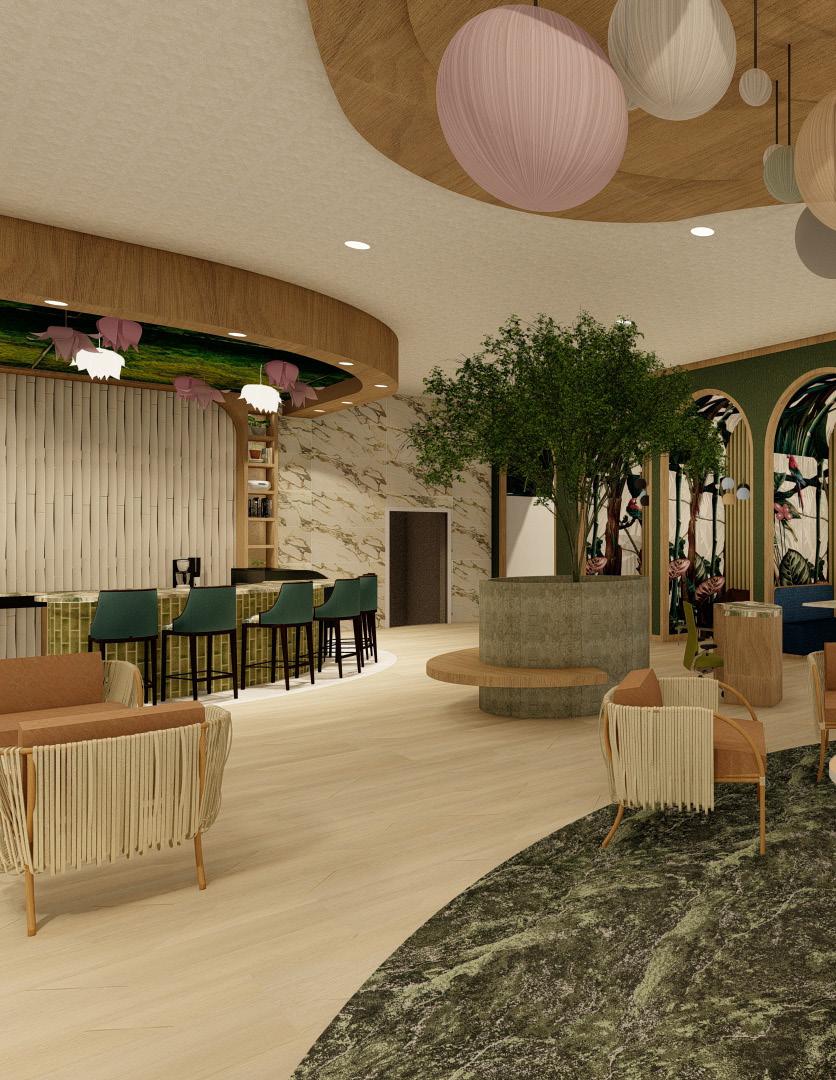 The Ivy is a luxury apartment complex by Lux Living being built in Westminster, Colorado. Our scope for this project included the main lobby space, a secondary lobby, the mail room, a gym, sky lounge, bistro, leasing office and the corridors. The client requested that the design concept be based on James Cameron Movie, Avatar and its jungle planet Pandora. For the more public spaces such as the lobbies, this theme is more subtle, really just utilizing textures and pops of colors. More literal elements were used in the spaces primarily used by residents such as floors that illuminate when walked upon, and imagery that nods to the creatures that live on Pandora. One goal was to create as many feature walls and seating areas that could fit in the space. Bold wallcoverings, three-dimensional tiles, and colorful quartzite were used to carry the theme of Pandora throughout.