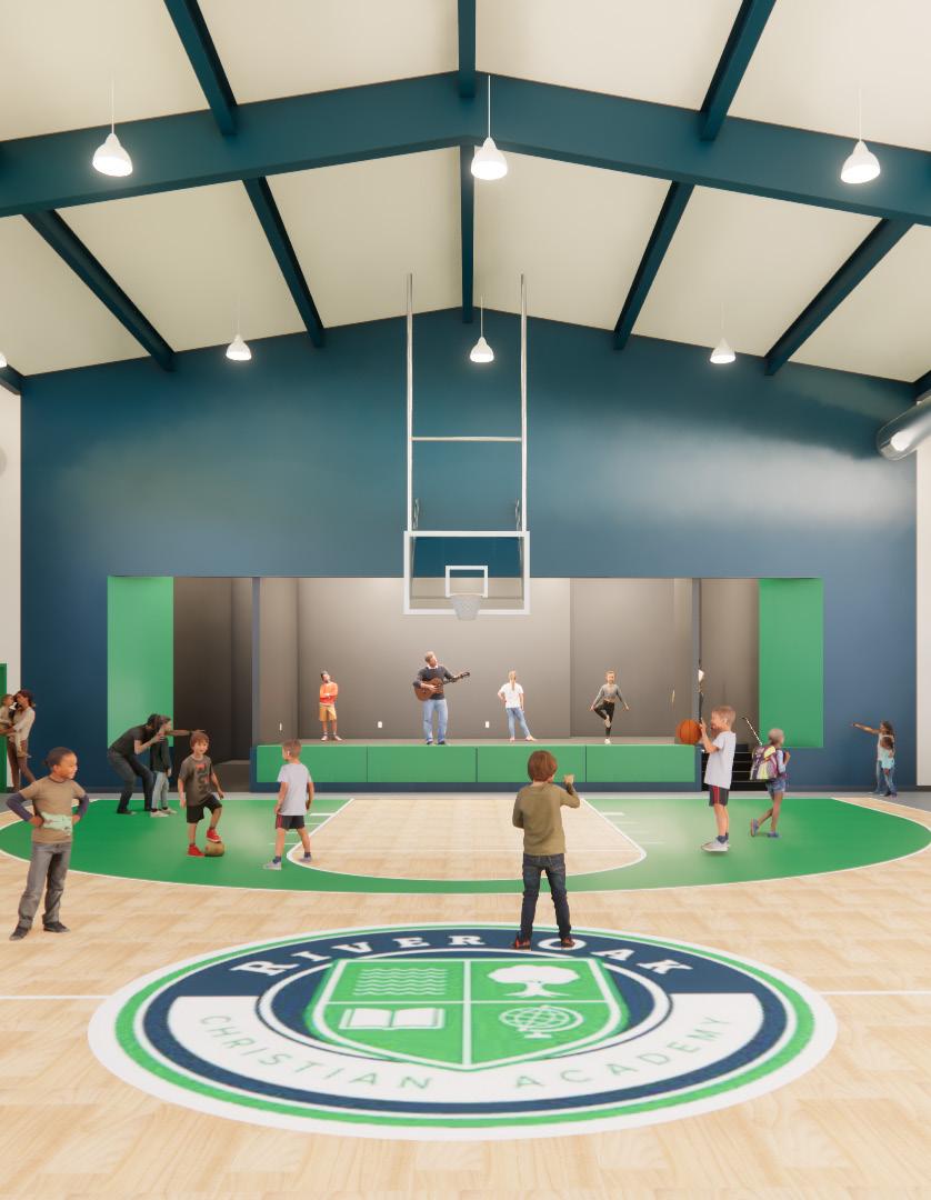 River Oak Christian Academy is a non-denominational Christian school in Jefferson City, MO. They are an independent non-profit organization originally only offering pre-K - 5th grade classes, but expanded to add a 6th grade in the fall of 2021 with the goal to add 7th and 8th grade classes in the near future. This goal meant that the school would need a new space to fit the added students. The project started as a new build, but their tight budget and lists of wants did not allow for an all-new build. They purchased an existing medical office building with the plan to add a pre-engineered metal building in the back for a gym. To ensure that the project was kept in budget, many of the design elements used were created with paint and inexpensive materials.