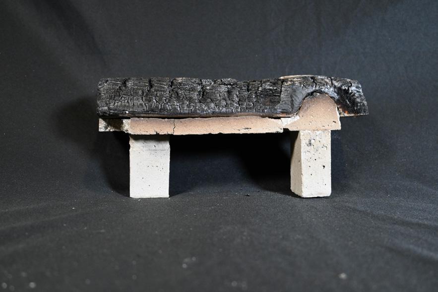 This project began as an exploration into the potentials of natural imperfections in wood, like knots and cracks, as joints and connections. Each of the first three pieces built upon the knowledge gained in the last and experimented in new ways. The first tested the construction method, size limitations, and directions of the pour. The second then refined the construction and experimented with creating larger legs out of multiple knots at once. The third continued refining the construction method and changed the axis of the wood and, therefore, the resulting pour. Simultaneously, a series of investigations took place into the potential of burning the wood to reveal the geometry of the concrete joint. Initial failed experiments using an open flame led to the introduction of a different cementitious material, called castable refractory. This material proved promising for future exploration as, when fired in a kiln, it retains its strength, removes all trace of the wood, and is lighter than traditional concrete.