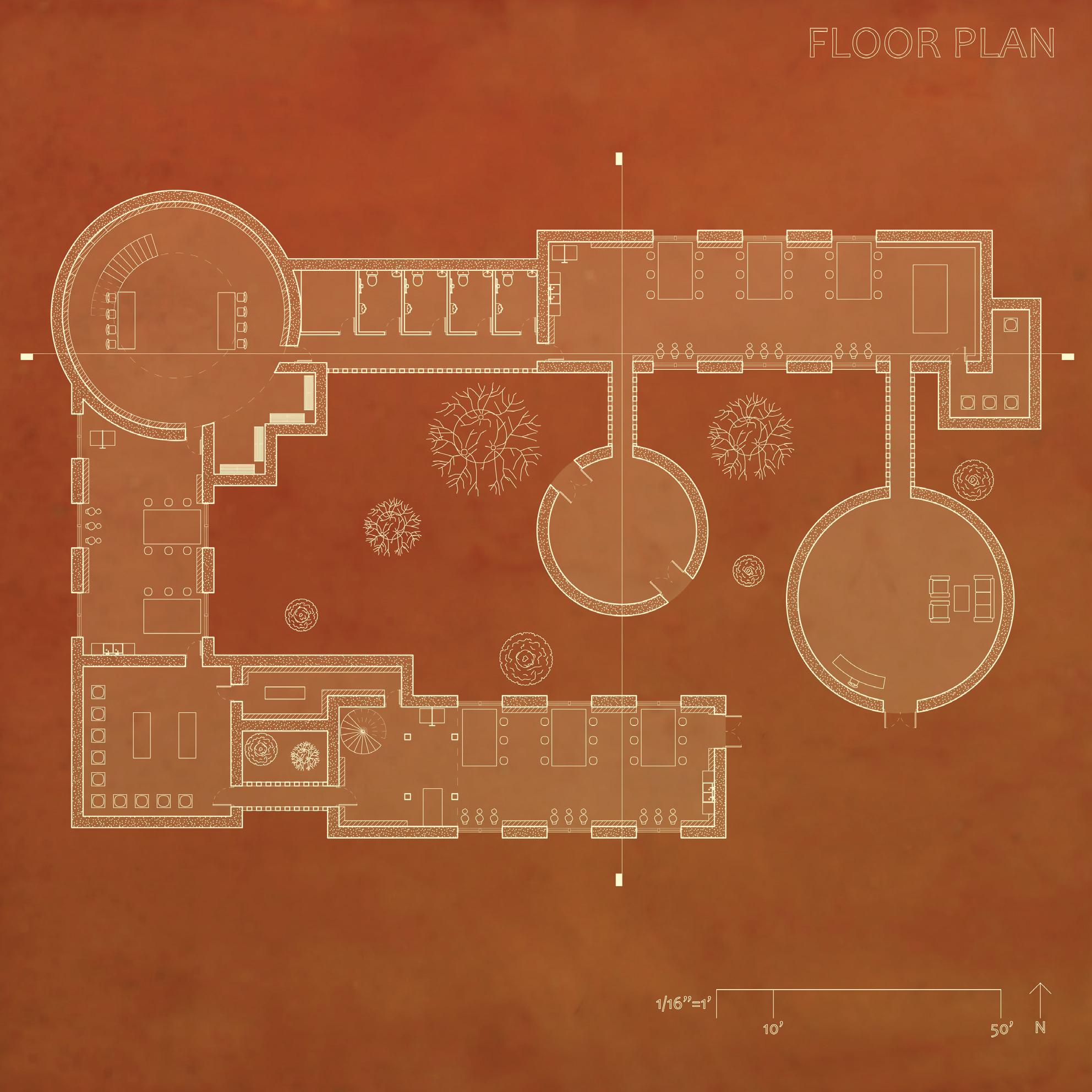 This project aims to create an all-encompassing space for a collective to create ceramics. Participants are able to create their own ceramics by hand, from scratch, starting with the excavation of clay and ending with a finished ceramic product, all done by themselves. Sited along a steep hill, a winding path was created to allow access to each of the spaces and a separate path cutting straight through the land frames the view of the surrounding landscape. The spaces are built using rammed earth walls and, due to the steep terrain, are partially embedded in the earth, furthering the connection between the ground and built spaces.