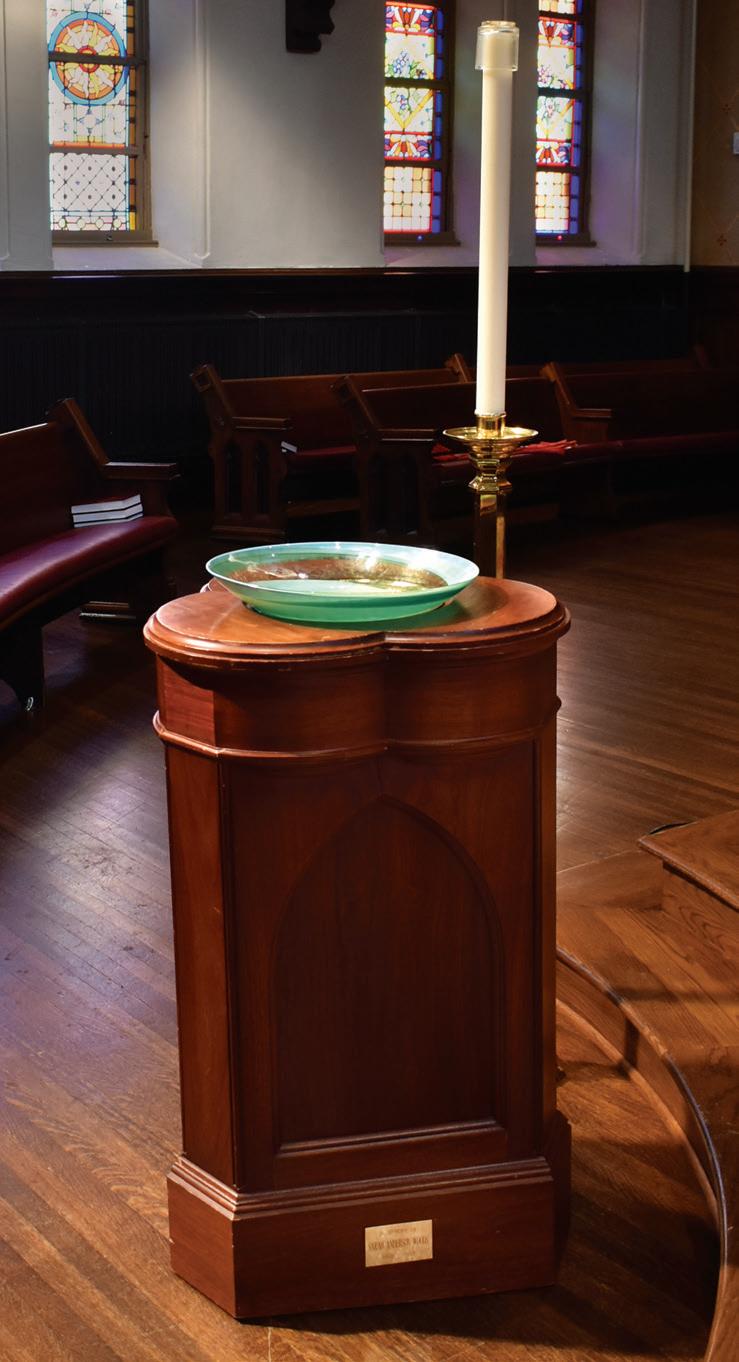 Kathy and Norm Kohn in the sanctuary by the baptismal fount. The base of the baptismal fount was created in 1988 with funds given in memory of Kathy’s father, Dr. Wilborn E. Upchurch, that little boy, Kathy mentions, who began this family’s journey at Central.